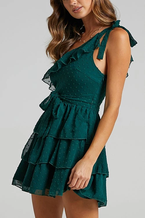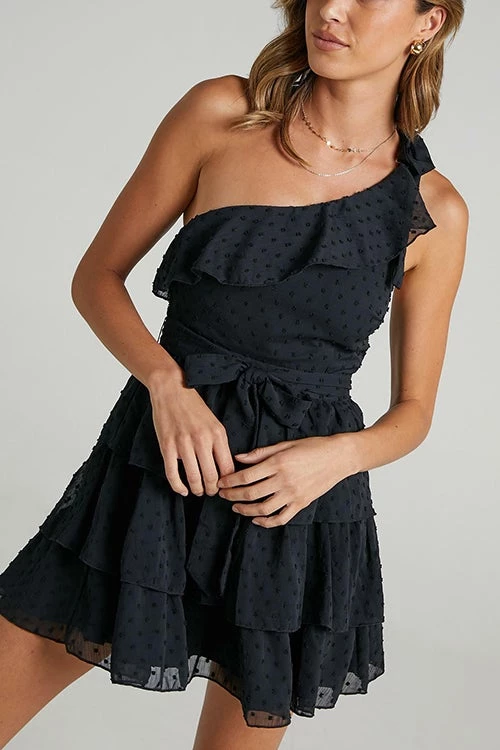 You’ll be looking dreamy in this Dress! This gorgeous little mini will turn heads at your next day party or special occasion. It’s made from a crepe-like fabric covered with a textured dobby detail and features a one-shoulder design, fitted waist and ruffles on the neckline and tiered skirt. Add a knockout pair of heels and fine jewellery to round out the look!