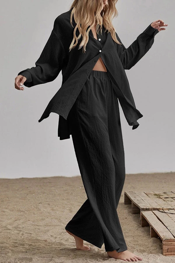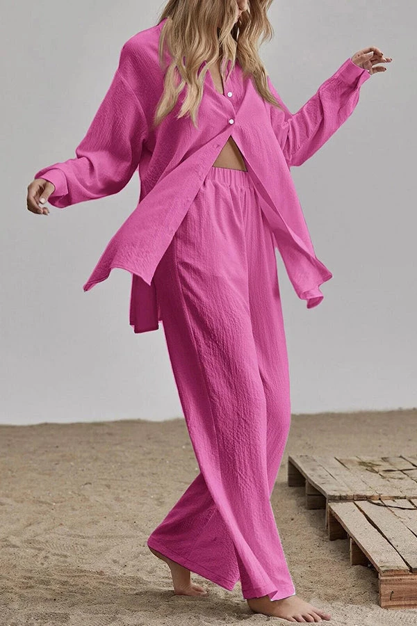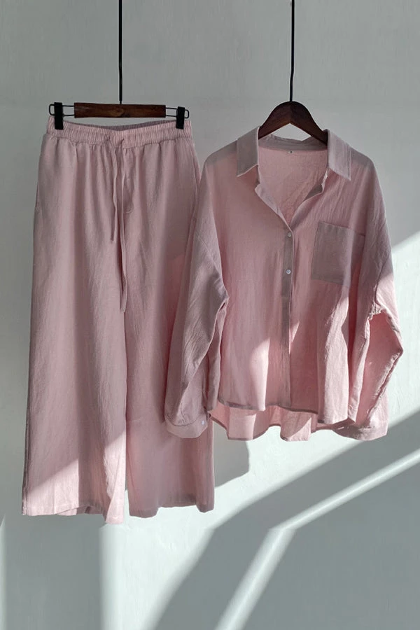 Menswear inspired and stylishly comfortable, the Oversized shirt and Pants Set is great for work or as elevated streetwear. This matching set comes with both pieces, a blazer and flowy pants.  The shirt is single breasted and the pants are wide legged