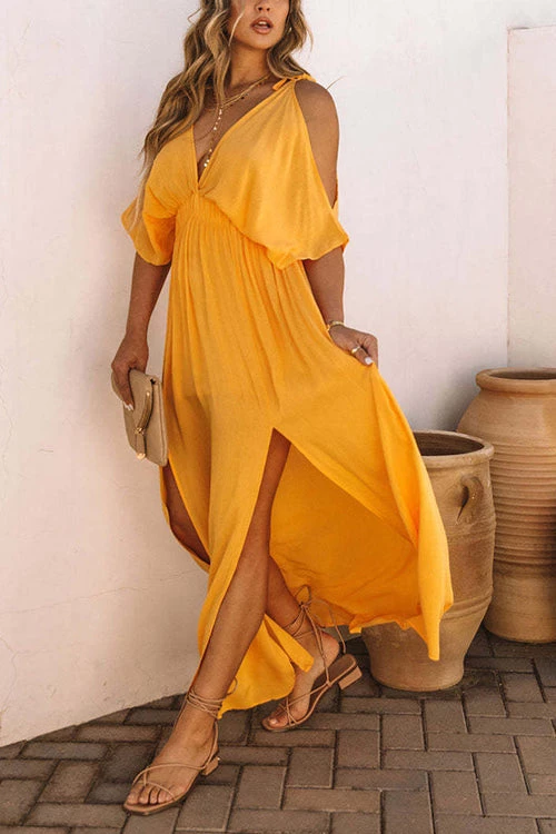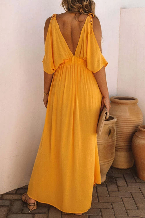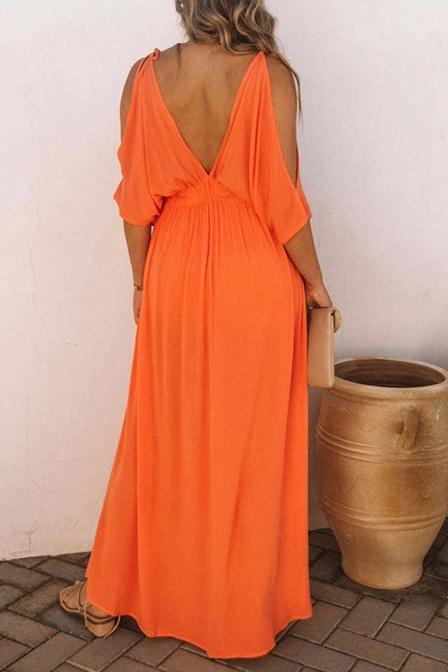 All eyes will be on you in this gorgeous kimono sleeve maxi dress. Featuring a sexy open tie-back detail, flirty side slits, and a flattering v-neckline. A stunning and versatile style that looks incredible as a beach cover-up, or dressed up for your next special occasion.
