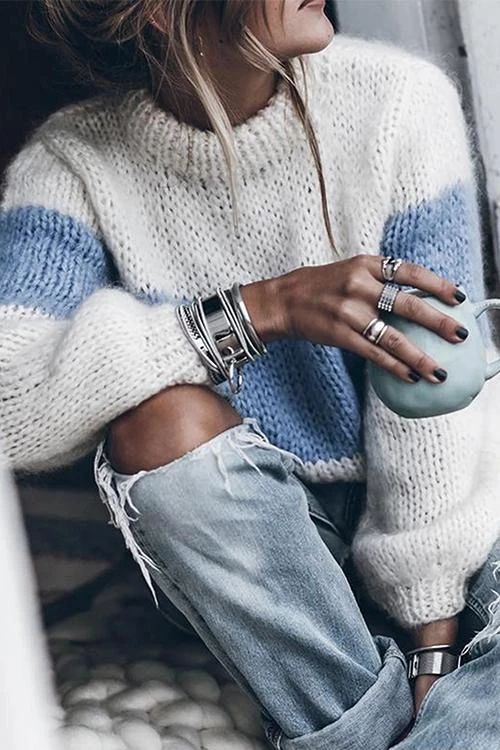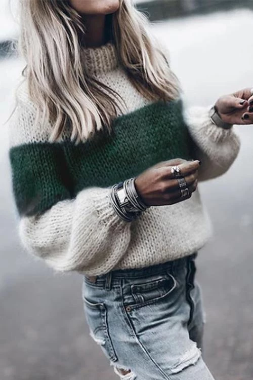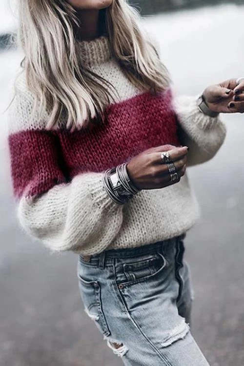 This knit sweater features vibrant stripes that provide a pop of color to the gloomy winter days.