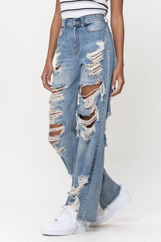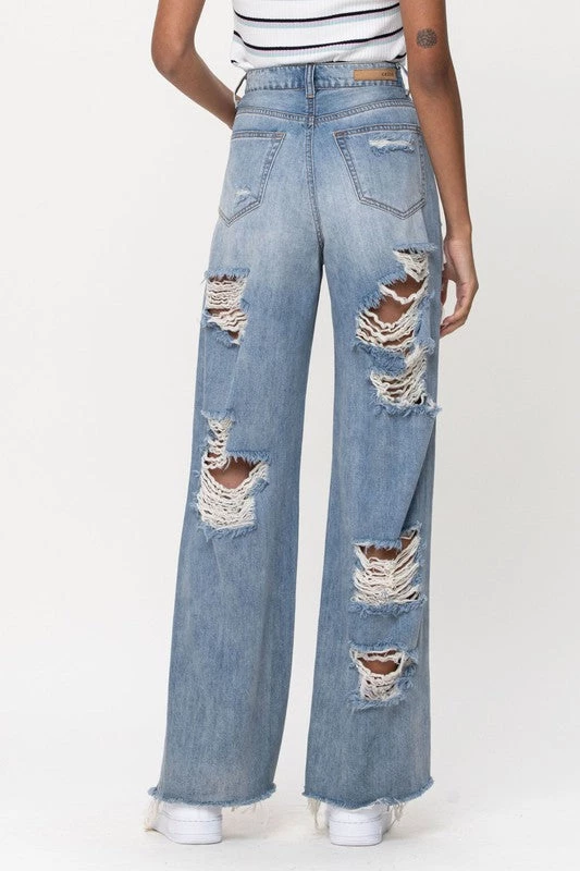Throwback-style high-rise jean. Built from a vintage-look classic medium denim wash with a slouchy, relaxed fit through the wide leg that puddles at the ankles. Destroyed at the leg with 5 pocket styling and a zipper fly.Â