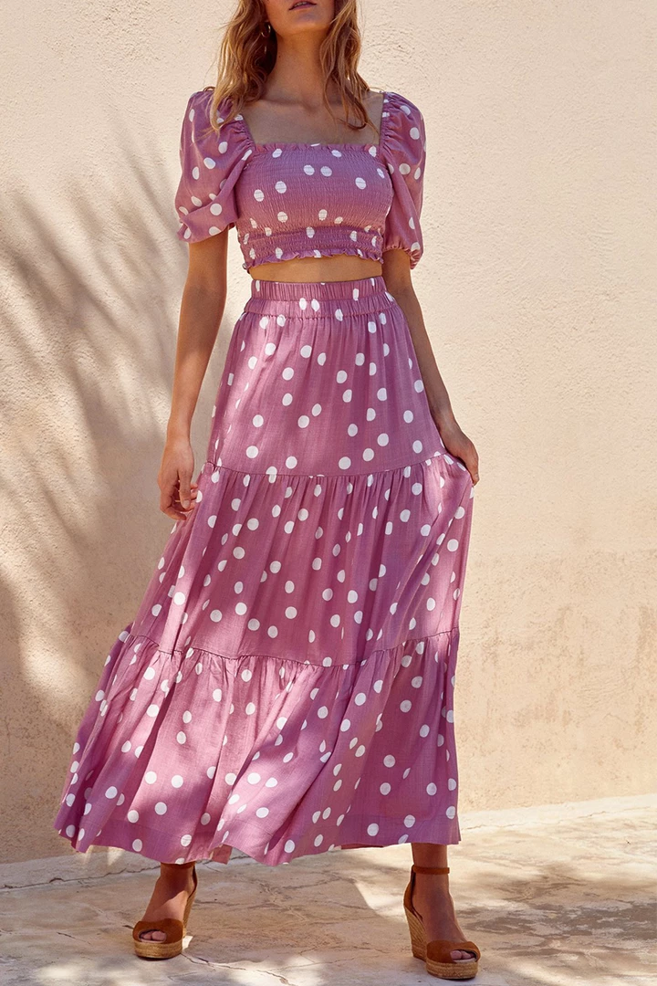 This two-piece set is everything you need! The top can be worn on or off the shoulder, and has elastic in the sleeves, neckline, and waist. In a beautiful and classy dot print, the crop top and maxi skirt can be worn together or mixed and matched to get the best of your investment.