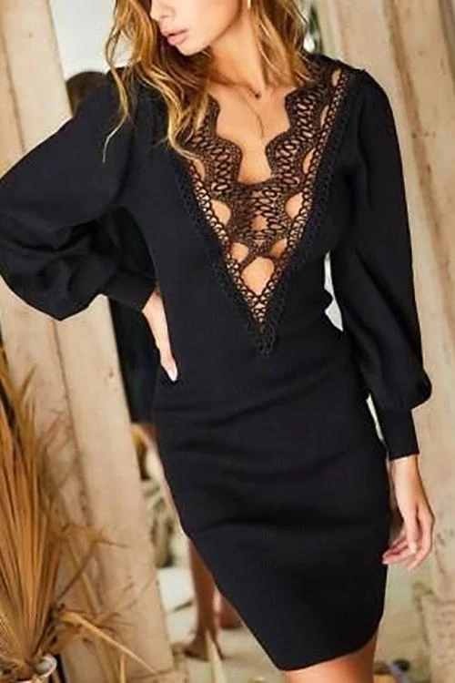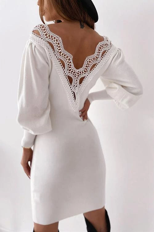 IMPRESS YOUR DATE IN THIS BLACK LACE BACK SWEATER DRESS! THE FIT IS SO FLATTERING & IS STILL SO COMFORTABLE TO WEAR! This Long Sleeve Short Dress with Lace Back is so adorable! Â We just love the intricate lace back detailing on this new piece! Such a cute fit and look for a fun last minute event!