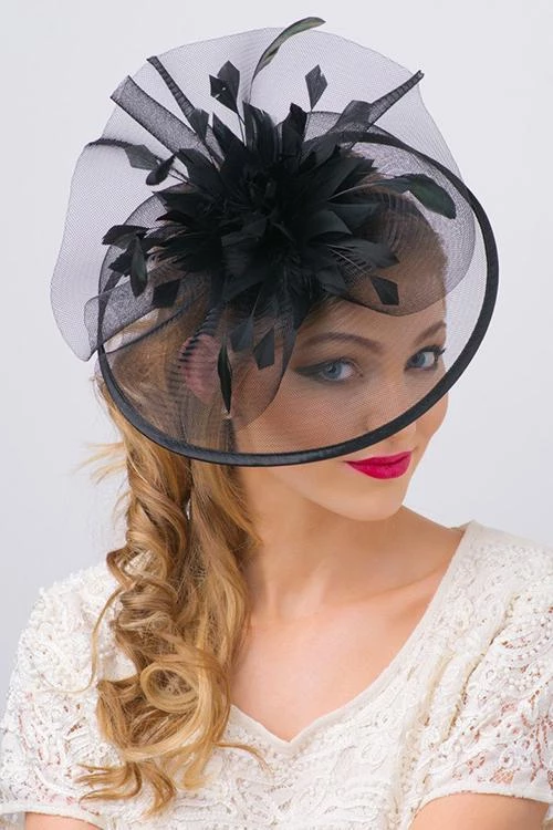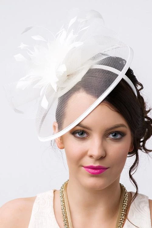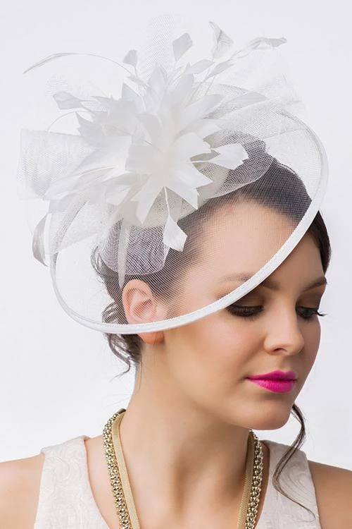 You are a picture of glamorous sophistication when you put on this romantic fascinator! Modern with a vintage touch, this elegant horse hair mesh base adorns a beautiful bouquet of soft feathers. A soft satin trim offers and allure that’s simply breathtaking.