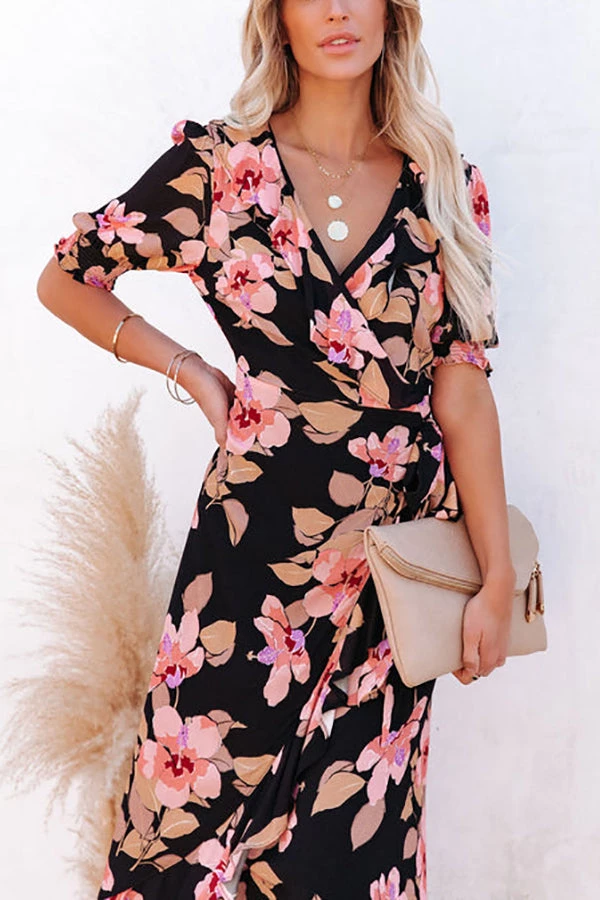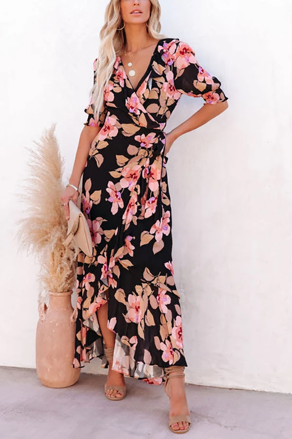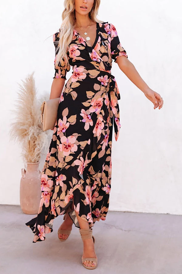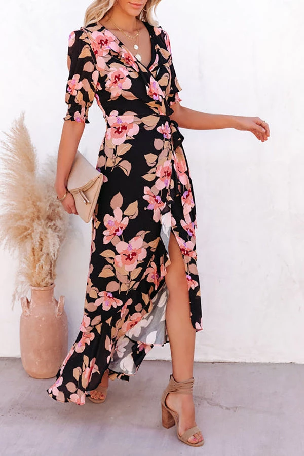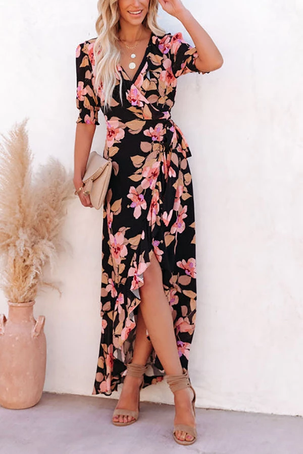 Stunning material with sunset floral print Maxi length with tulip style at front skirt Detachable waist tie Zipper at back bodice Loose sleeves Lined to upper thigh Ruffle detailing along skirt hemÂ