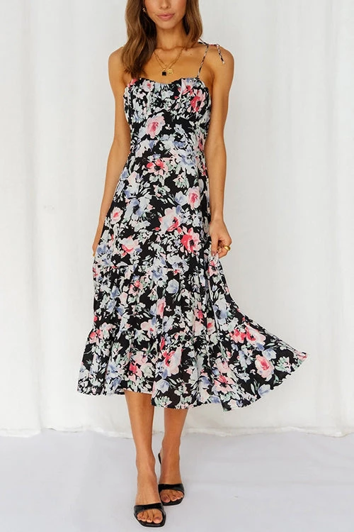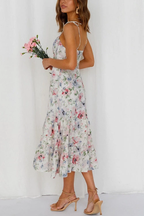 Our beautiful Dress can take you form day to night! This lovely midi dress is made from white fabric with a floral print throughout. She has all the details we love. a gathered bust, tie-up shoulder straps and a flowing mid-length skirt. Style her with mules and a mini bag for a chic weekend look.Â