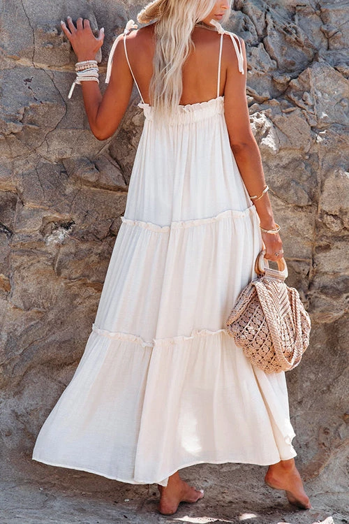 The show wherever you go in this black maxi! The Happy Hour Tiered Midi features an adjustable tie shoulder straps and a square elasticize bust on a flowy gauzy fabrication finished on a flawless tiered ruffled midi length! This eye-catching classic black maxi dress can be styled with a dark neutral heel for a an easy breezy summer look!