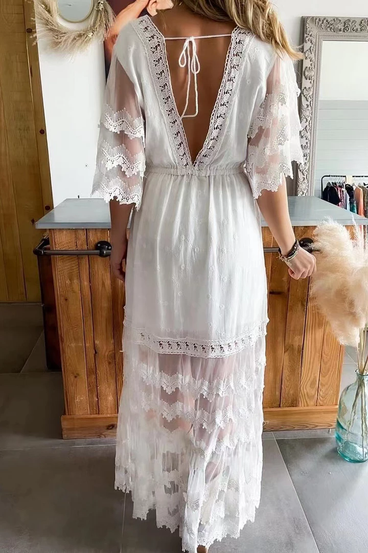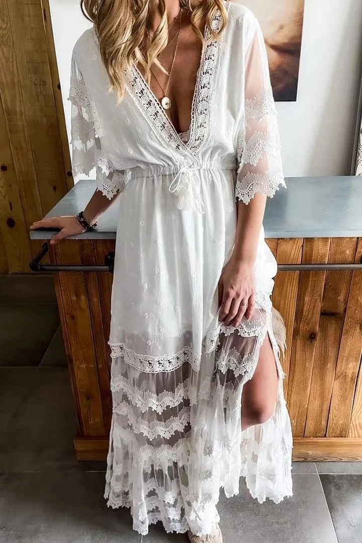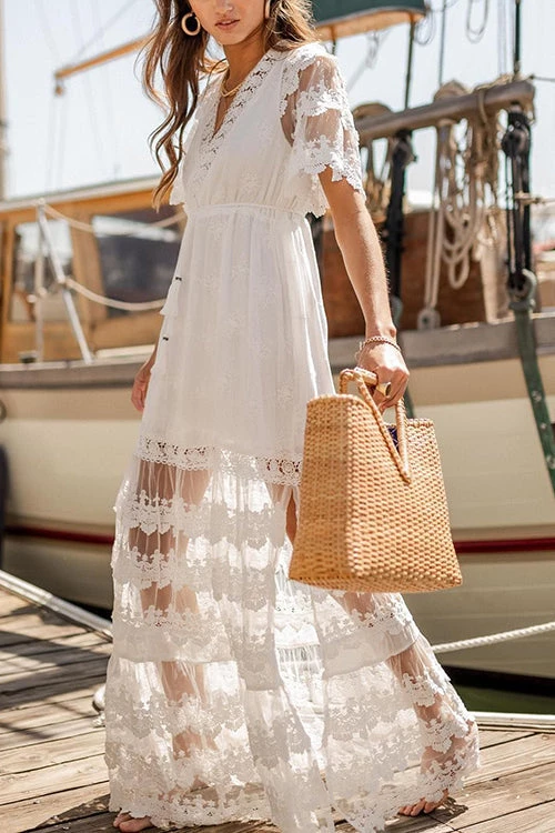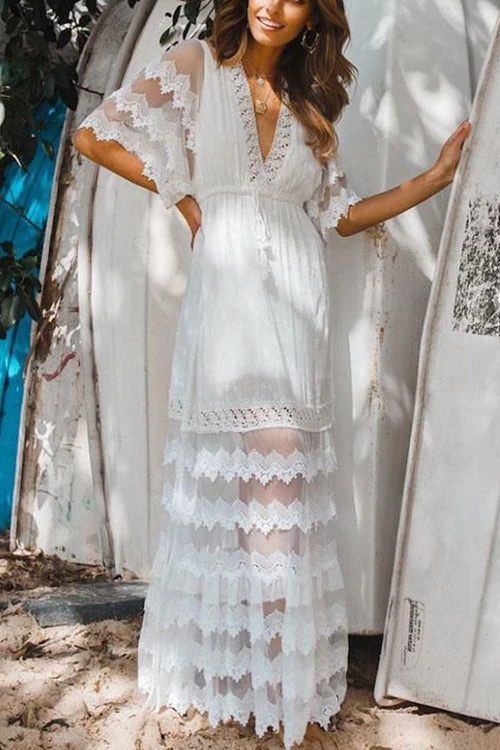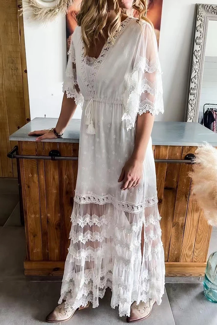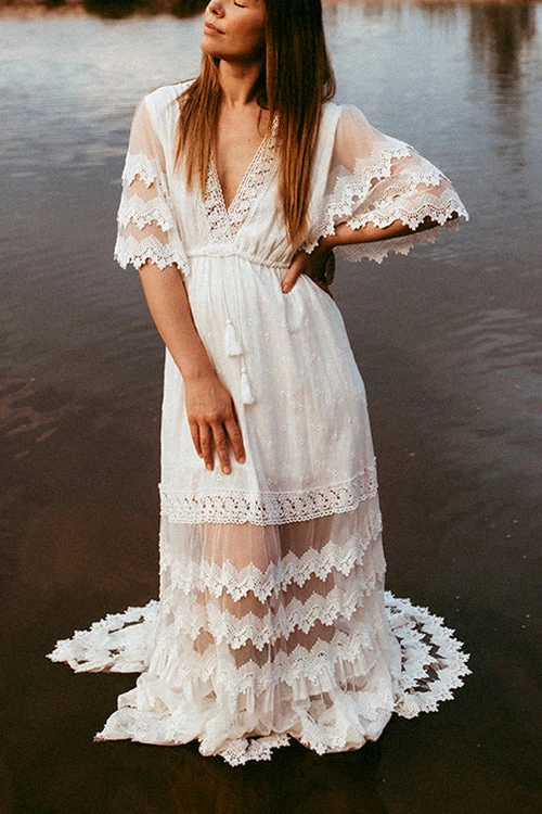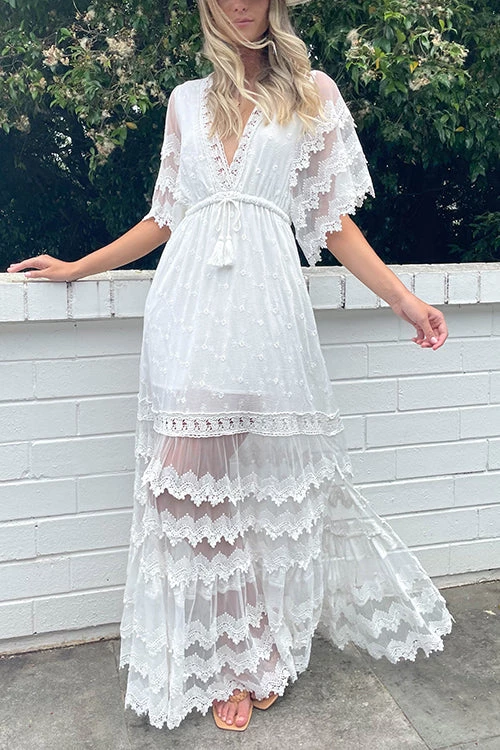 Featuring layers of gorgeous cotton lace that is perfectly feminine and a bohemian lover’s dream… Picture this stunning dress being worn for your beach wedding, or your vow renewals, a photo shoot, a maternity shoot, a baby shower, or just because you love it and want it! This beautiful white embroidered cotton and lace dress fits like a dream! It’s timeless and elegant and a ‘must have’ in your collection.