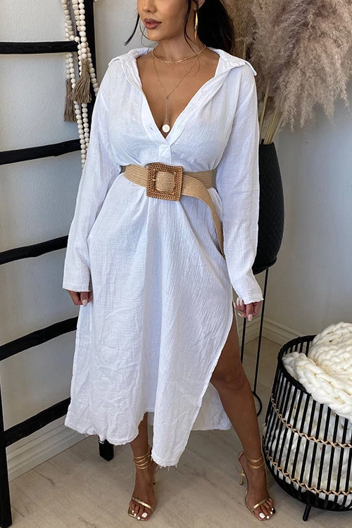 Tunic dresses have been a hot trend this season! Perfect for year round! Midi Length Henley Buttons Side Slits Frayed Hem