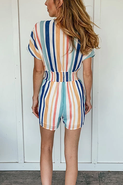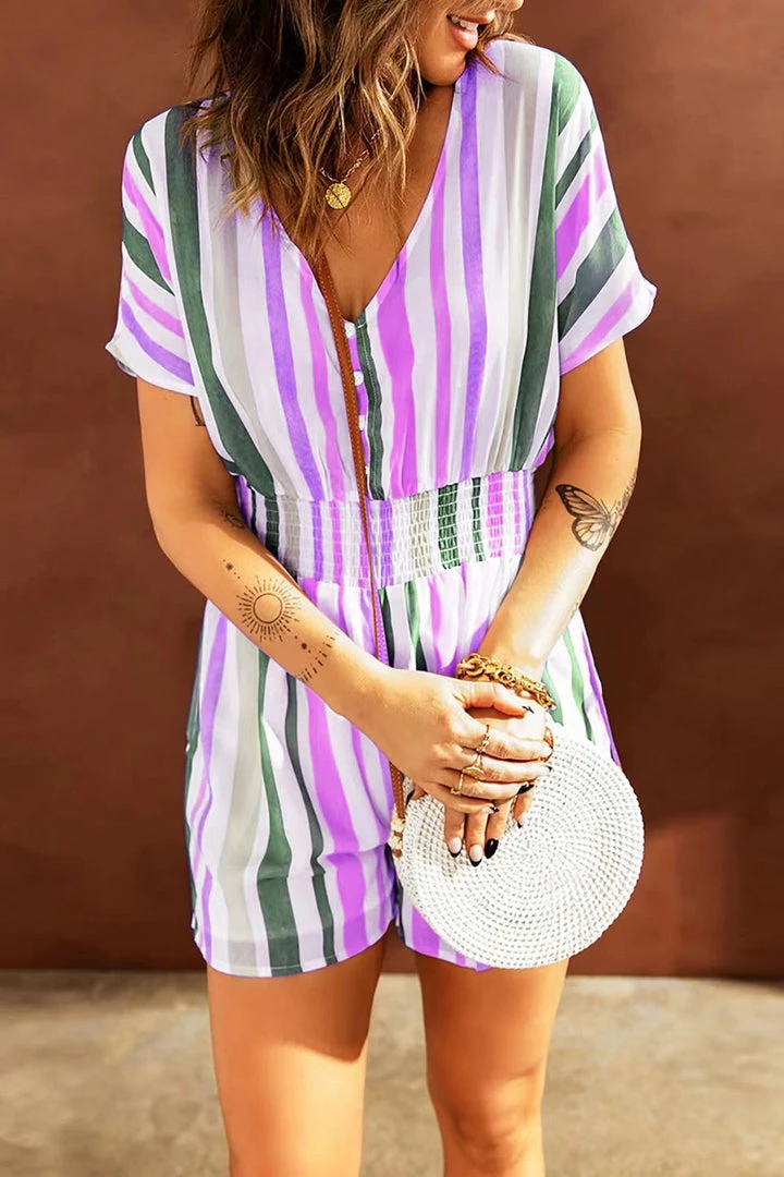 Um hello romper!! Multicolor stripes, buttoned detail front. V-neck and cinched elastic waist gives a sexy silhouette! It is the perfect texture and colors for Spring! Pair it with sandals and you’re ready to go!