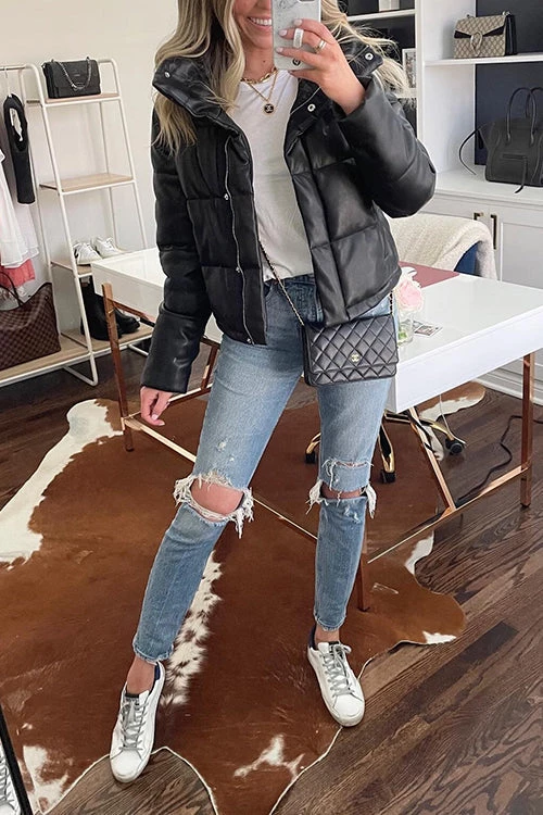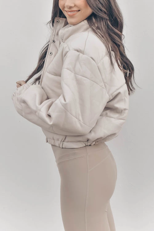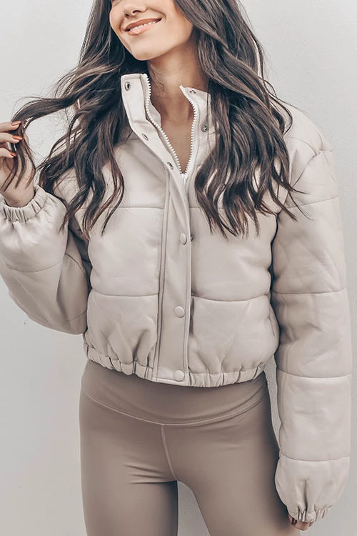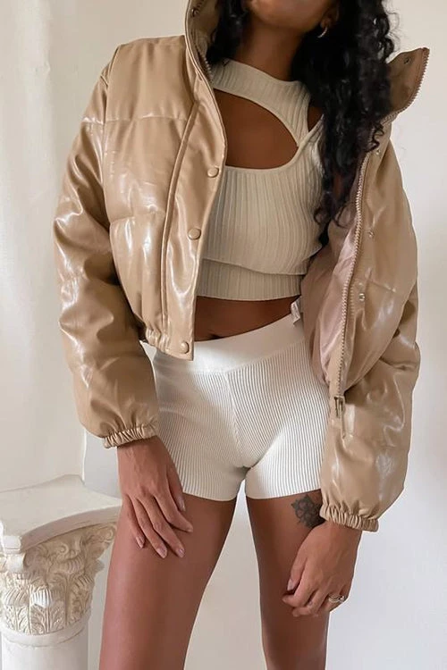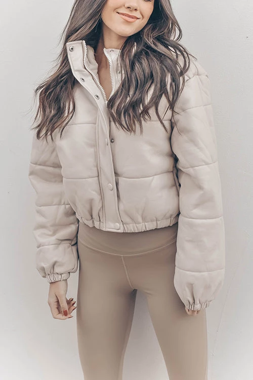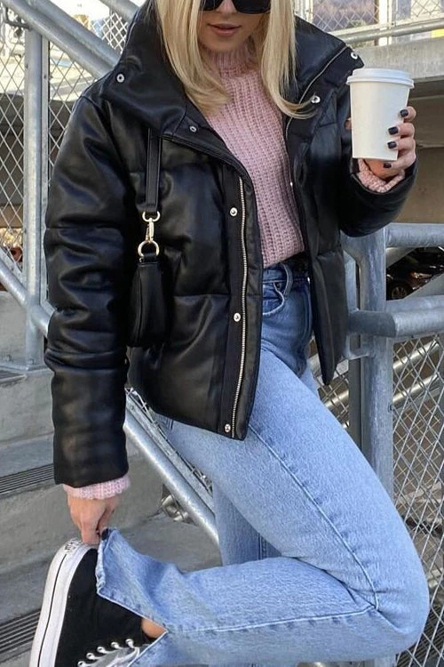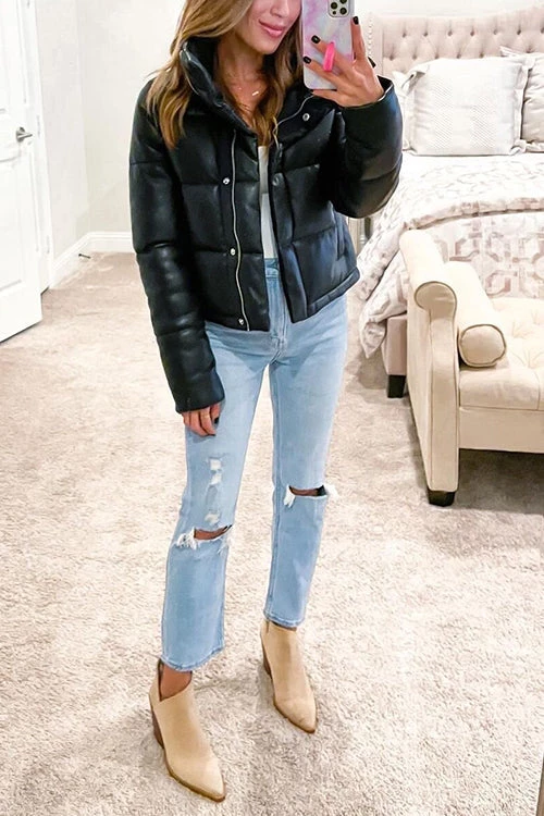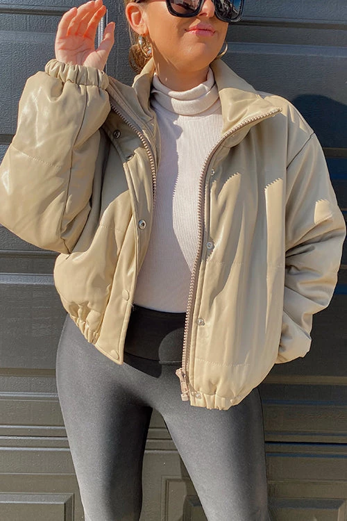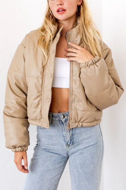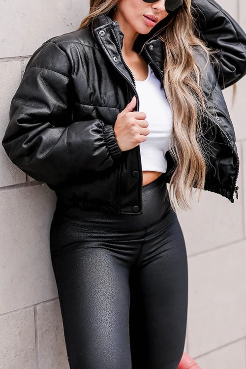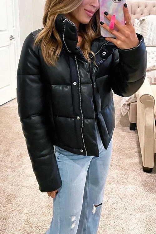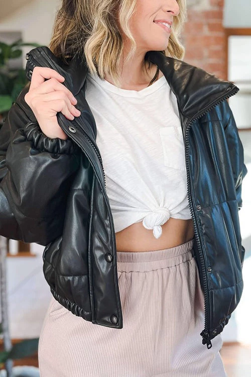 Ok so this bomber jacket is AMAZING. Featuring high quality soft faux leather, and a warm puffy fit. Front button and zip closure, and front pockets. Bomber fit, so it hits at the waist. This jacket is the upgrade you didn’t know your winter wardrobe needed and the quality is FABULOUS. You’ll have everyone doing a double take when you walk by in this amazing puffer jacket! The vegan leather fabric gives it a trendy edge, and it’s so easy to pair with all of your favorite pieces.Â