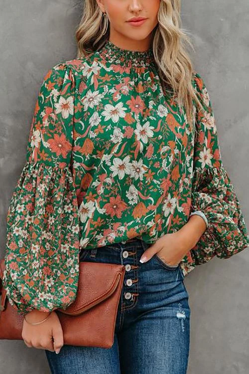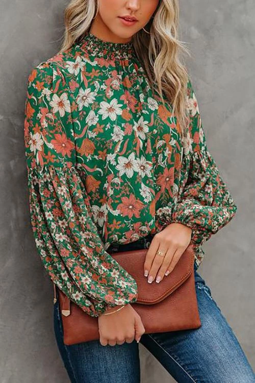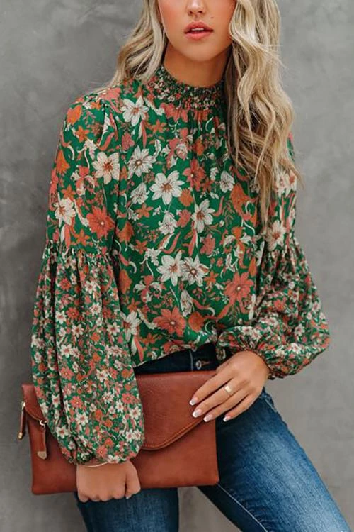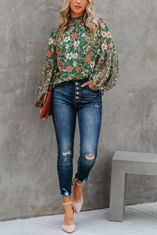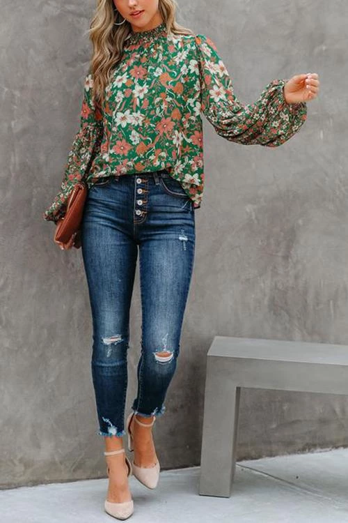 The Boho Blouse is a light and flowy top in the most delicate blue with floral print. Featuring long sleeves and a ruffle neck with a small ruffle front trim.Â