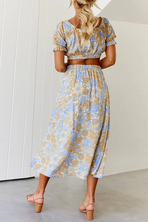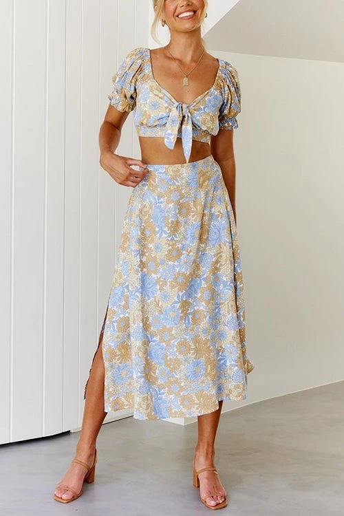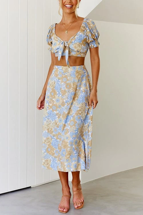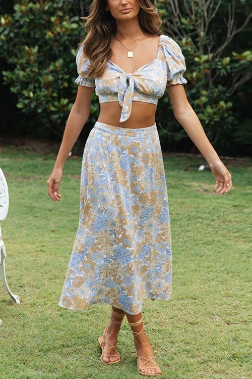 Stylist Tips: How good is a fresh set for the Spring time?! We love the new which features a blue and yellow toned floral print, short puff sleeves with ruffled hems, cropped fit, front tie-knot and a sweetheart neckline. This look isn’t complete without the matching Skirt, a pair of nude sandals and dainty gold jewels for a fresh every