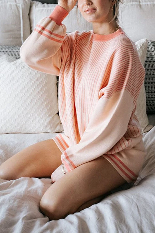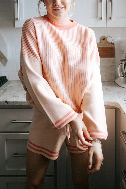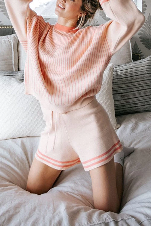 In love with this cozy and chic knit set with neutral stripes design and details. Top is an oversized fit with dramatic sleeve gathering at sleeve. Shorts are elastic, high waist. Great to mix and match with different tops and bottoms.