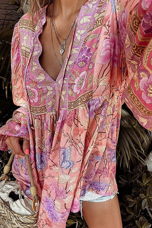 Step out in the Utopia Blouse in Flamingo by SPELL. Featured in their newest collection, this long sleeve tunic features a v-neckline. Adjustable and decorative ties throughout.Â