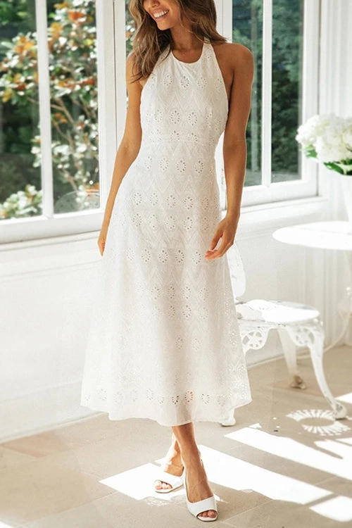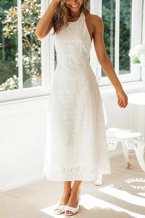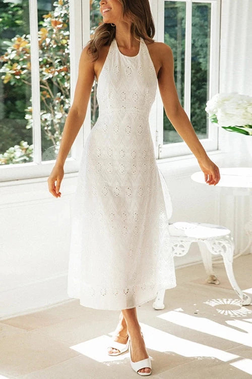 Sweep into your next summer party in our statement Broderie Anglaise maxi dress. Defined by a shoulder-baring halter-neck fit, strappy back, neat buttons and a peekaboo panel at the waist, this flowing style perfectly frames your favorite metallic heels.