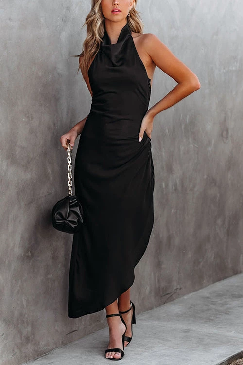 A draped dress is so timeless and chic! Our Havyn Satin Asymmetrical Halter Midi Dress in mocha features a gathered side. Secured with a concealed side zipper closure.