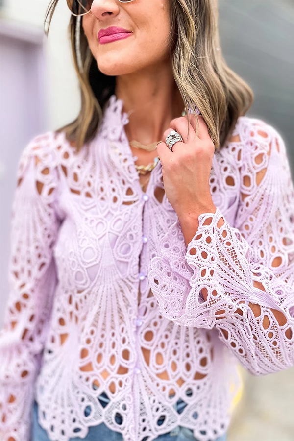 Sheer in form and striking in appearance, from front to back this bold and beautiful blouse is designed to show off your figure, and your chic sense of style every single time you wear it. The perfect way to catch attention, this tantalizing top features a see-through crochet lace fabrication, a button-up front, statement sleeves, and so much more. See-through lace fabrication Mock neck Functional front buttons Bell sleeves with elasticized cuffs Scalloped hem Unlined Close fit with no stretchÂ