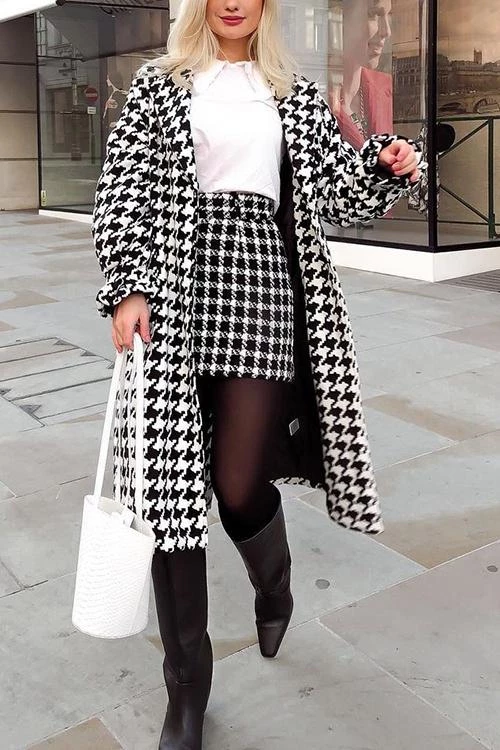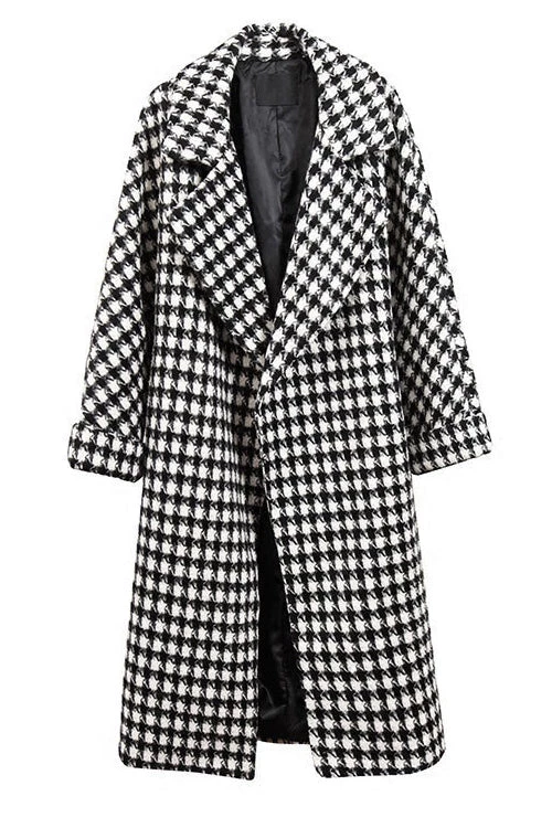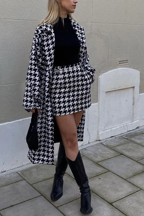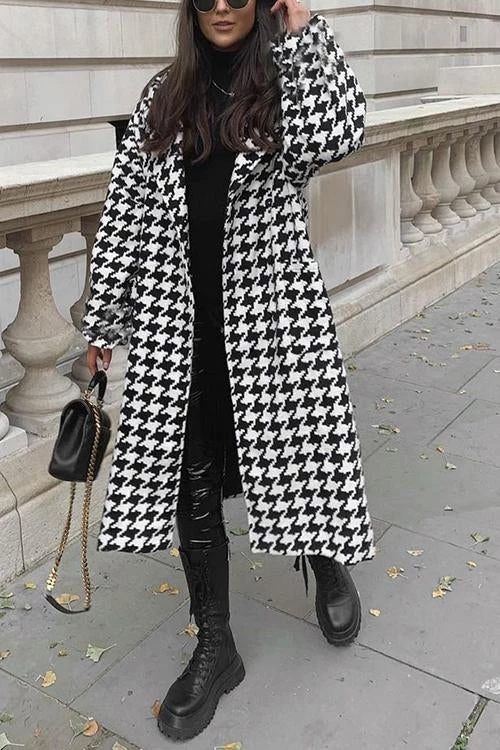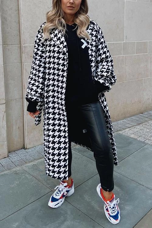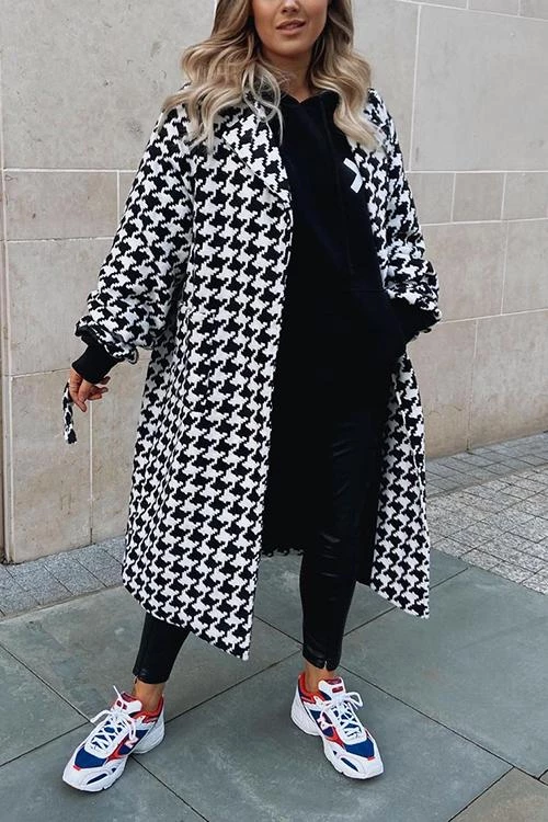Cosy wool coat with a houndstooth pattern. Trench-style with vintage vibes. This coat brings a cool preppy vibe to any silhouette.