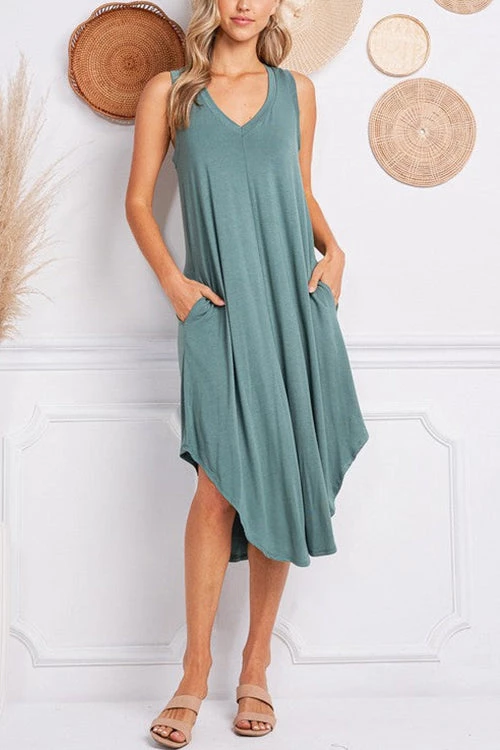 So comfy is our I Think Not V-Neck Midi Dress. This midi length dress features a v-neckline, rounded hemline on a sleeves, soft and flowy fabrication. This simple but cute basic midi dress will have you feeling comfy all day whether you are lounging around our running errands, this dress will be your new go-to! Style it with sandals for a chic look or rock it with your favorite sneakers and denim jacket to complete the look!