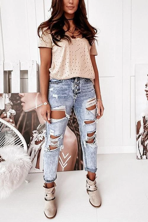 A must-have for fall! A super ripped jean makes any outfit look cool. Pair with chunky sweaters, sweatshirts, and cropped tees for an effortlessly chic look.