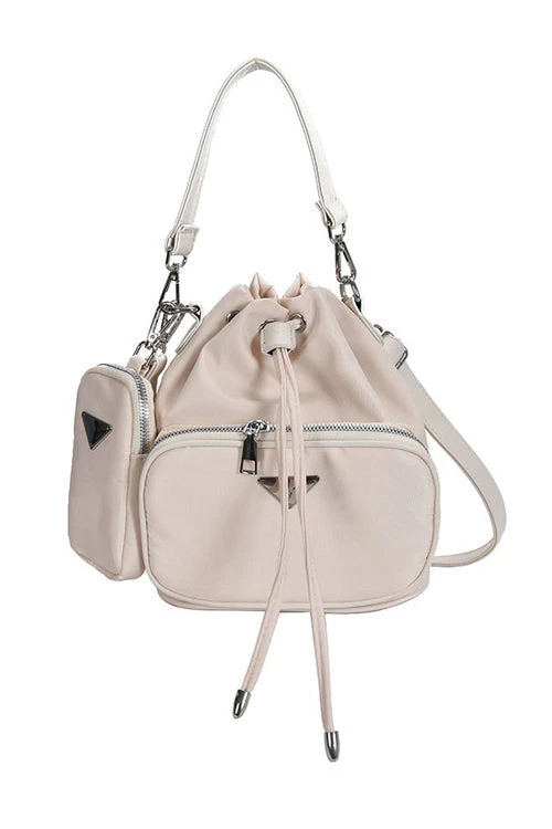 A timeless, ageless miniature bucket bag that can be taken from day to night. Perfect for carrying your bare necessities.  Detachable / adjustable strap handle for length and crossbody use.  Detachable / adjustable shoulder strap,Removable nylon pouch with zipper and Re-Edition,keychain ,Metal hardware ,metal triangle on the front , Front pocket with zipper, nylon lining, Adjustable strap, and drawstring closure , Inside pockets