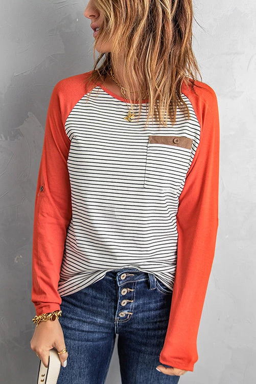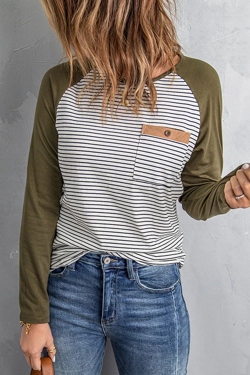 Kick back and get comfy, or head out for a day on the town in the Olive Stripe Raglan Top. This soft stretchy top is comfy for staying in, and cute for going out! This top features tiny olive stripes and an olive raglan sleeve with a small pocket detail. Pair this top with jeans or joggers.