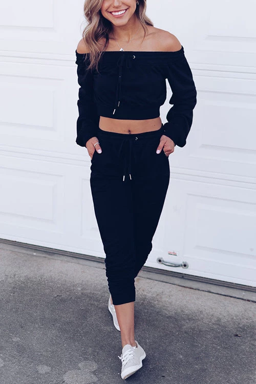 It’s all about comfort and leisure style in the Off The Shoulder Two-Piece Joggers Set. Designed on a black terry knit fabrication. Fitting comfortably with an elastic drawstring waist with matching off the shoulder top. The joggers has a relaxed fit leg and banded ankles for the ultimate jogger look. Slip your phone, keys and card holder into the side pockets for that quick store run! Pair yours with fresh sneakers!