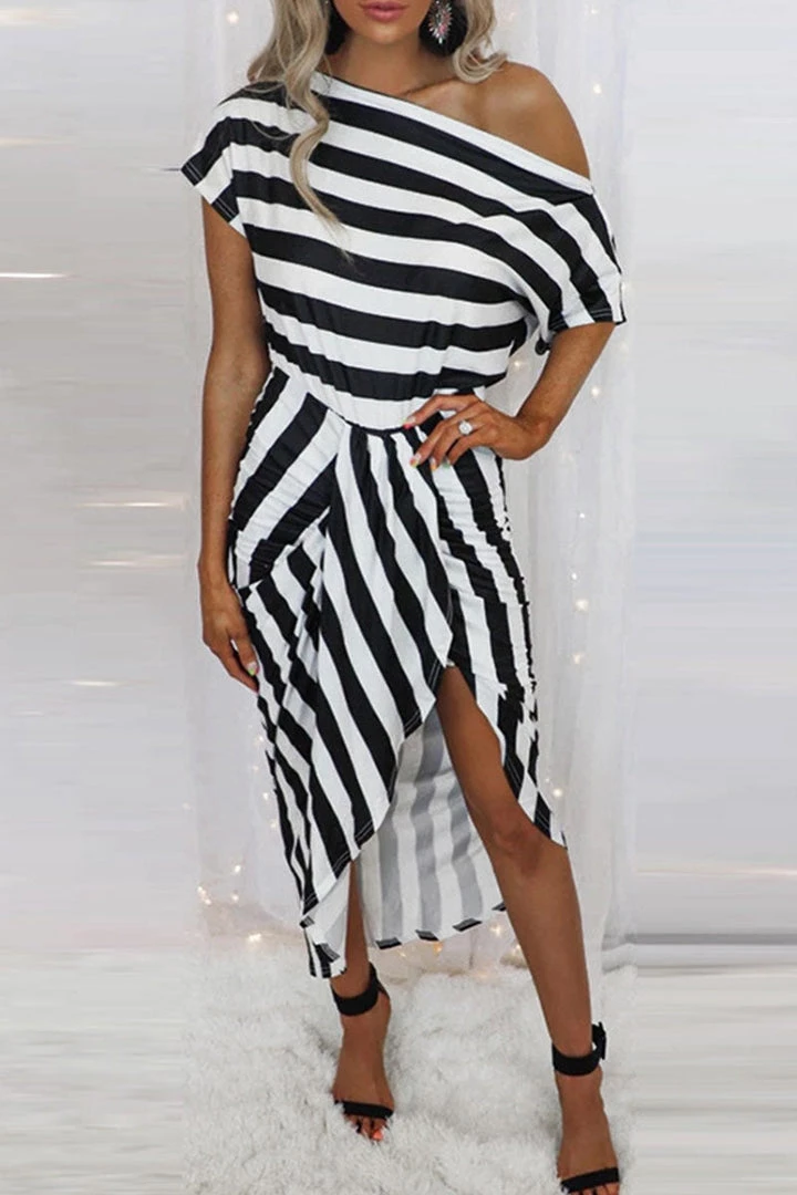 We love a striped dress and the asymmetrical details on this beauty is the added touch of perfection.Â