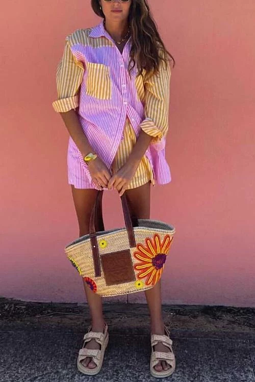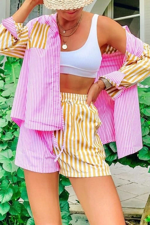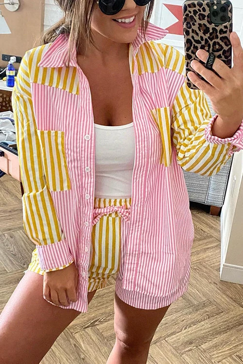 The Shirt set is a true holiday hero. The effortless beach shirt in a loose and breezy pyjama-style shape. Slip it over a bikini and the Jimmy Shorts for your next visit to the coast. Striped beach shirt Orange, white and pink Island Stripe Breezy cotton construction Collared neckline Button-through front Patch pockets to chest Curved hemine Slight sheerness under direct light