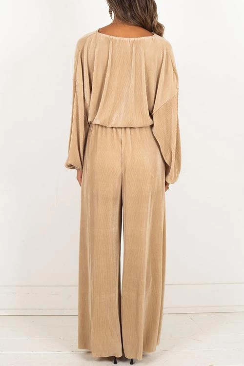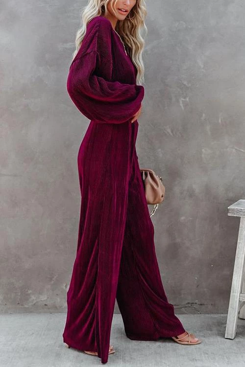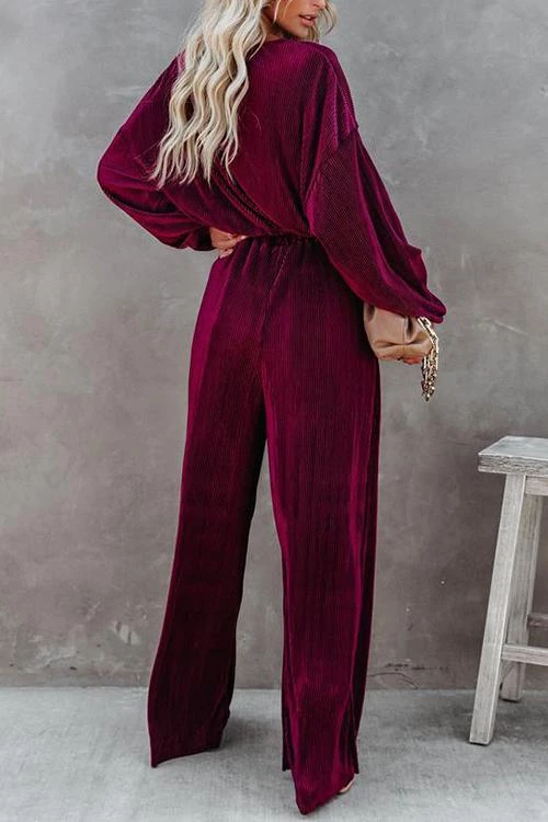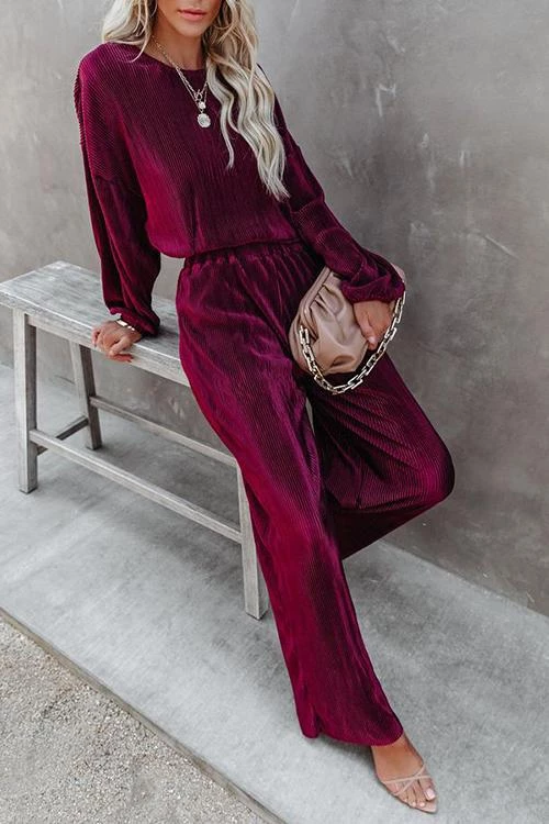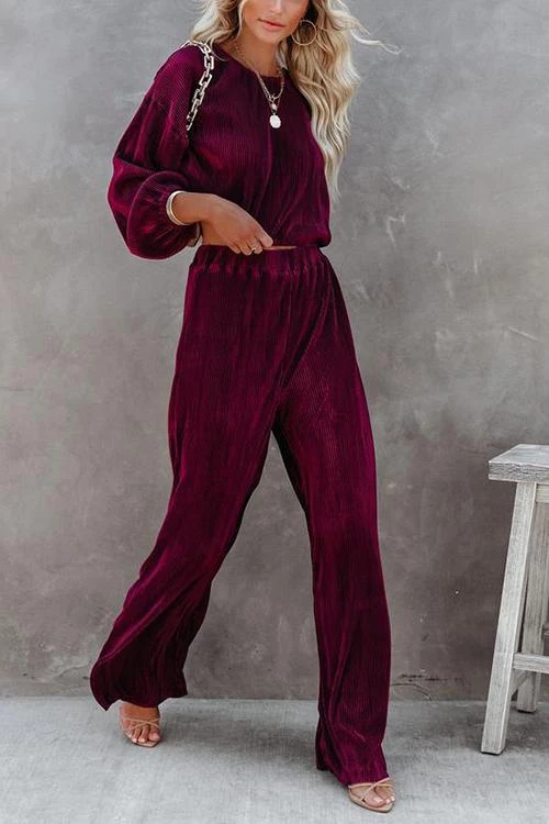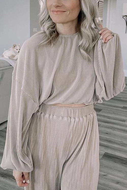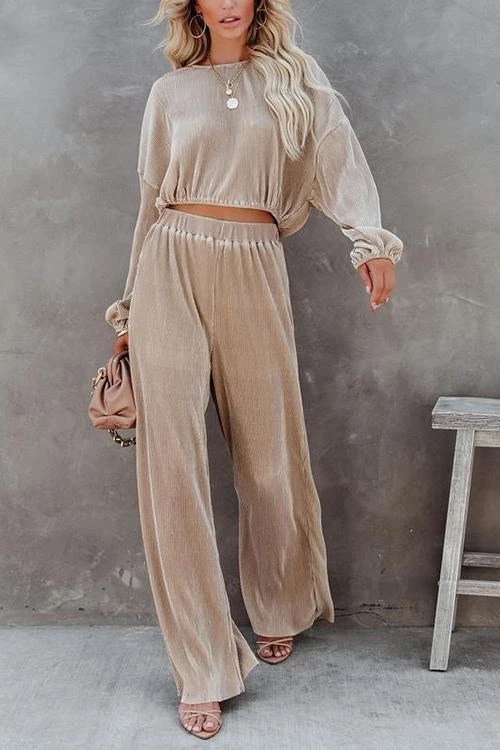 Pleated pants Set can be worn during the summer, into fall and winter. This set features high waisted elastic loose fitting pants and a crop flowy long sleeve top with droopy arms and elastic finishes. Style with nude heels or booties.