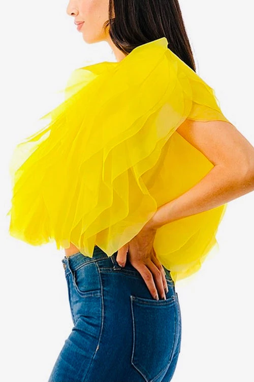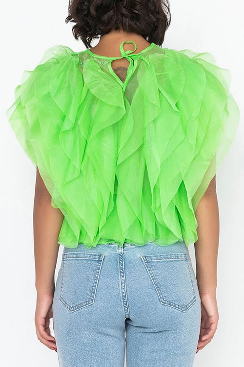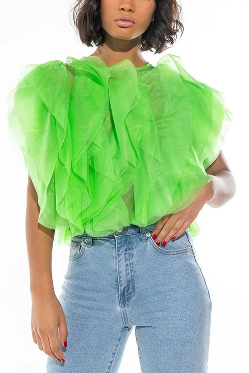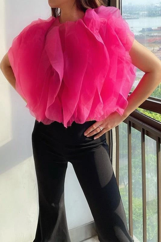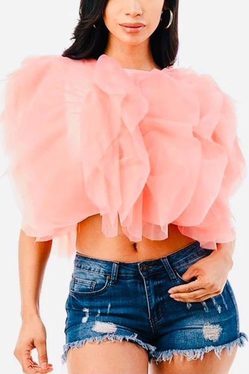 Ladies you’ll definitely stand out from the crowd in this cropped tulle top! This sleeveless top features ruffles all over in the front and back and are attached to a stretchy fabric. Pullover style that ties in the back. Perfect with a pair of jeans or skirt.