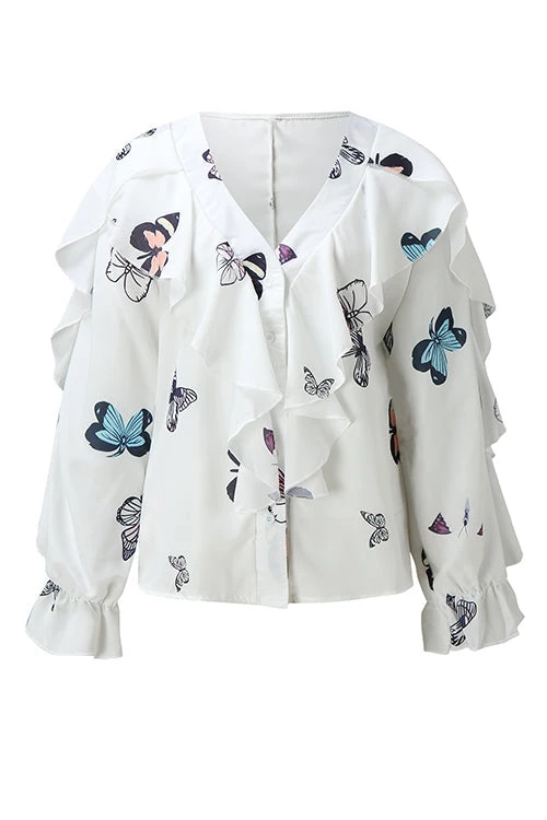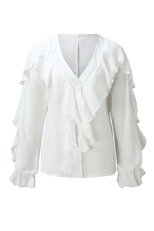 How fun and flirty is this top?! One of us FAVS ever to launch! So lightweight and the ruffles add such a cute flair! Stand out in the V-Neck Solid Wide Sleeve Blouse!