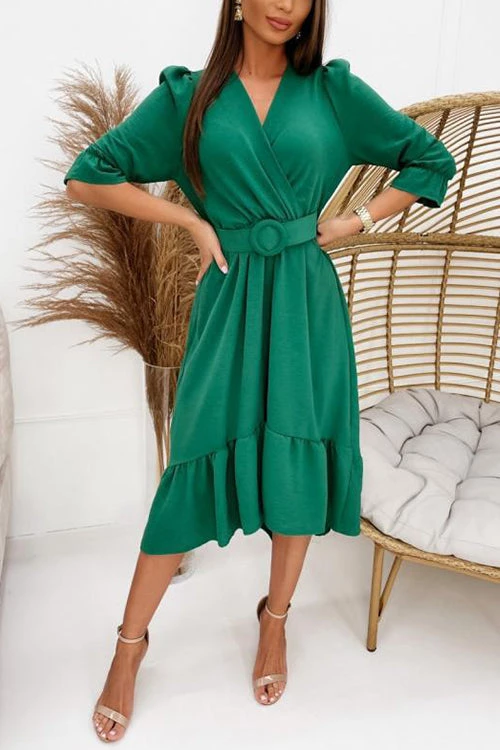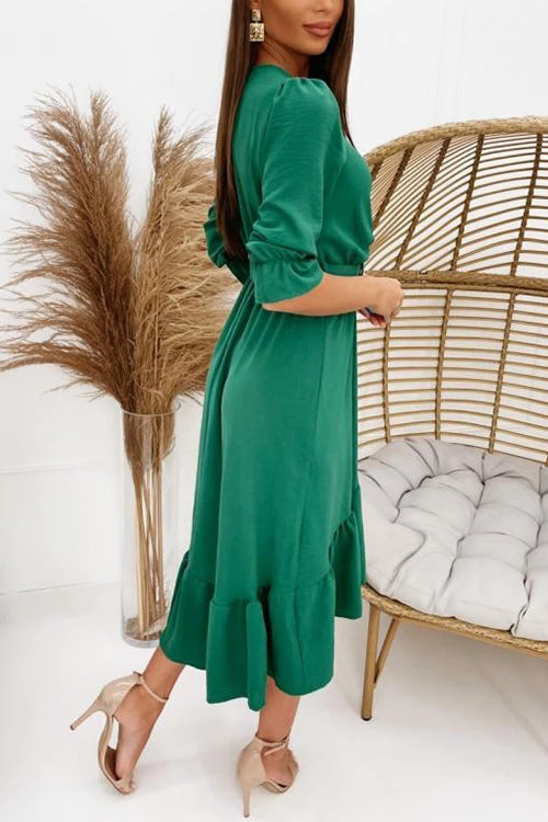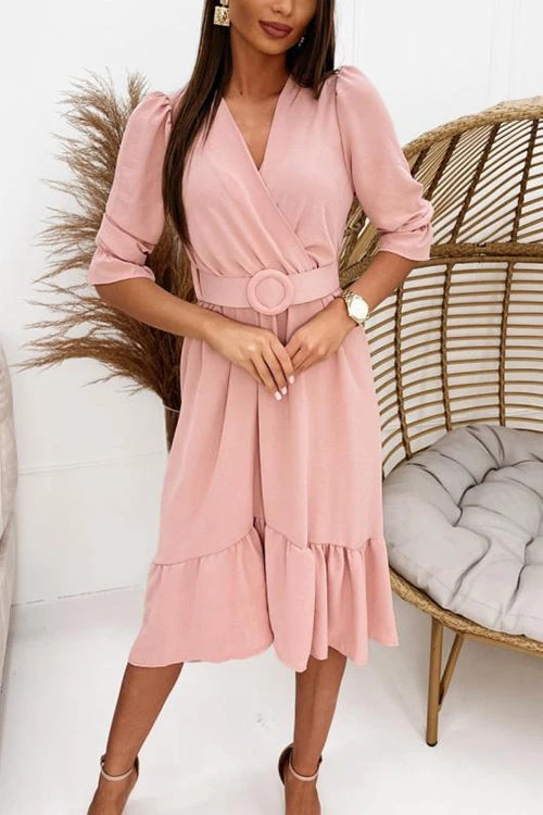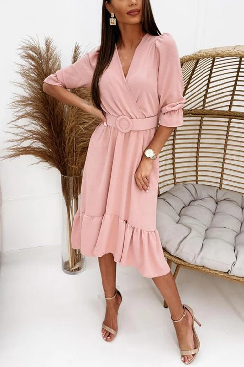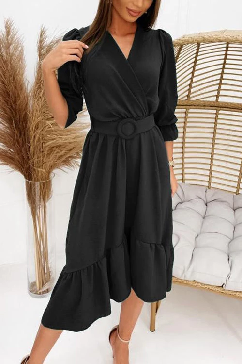 This wrap cocktail dress is fun, feminine and flirty. The soft ruffle hem and 3/4 length flared sleeves add a touch of romance to the look, while the belt to change your look from loose to fitted.