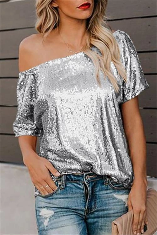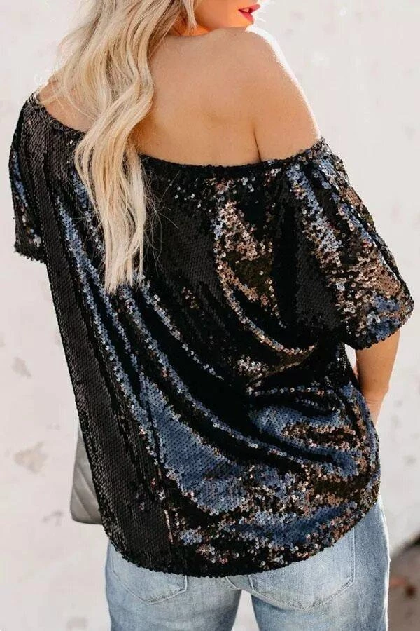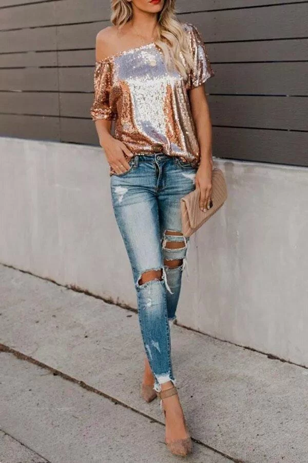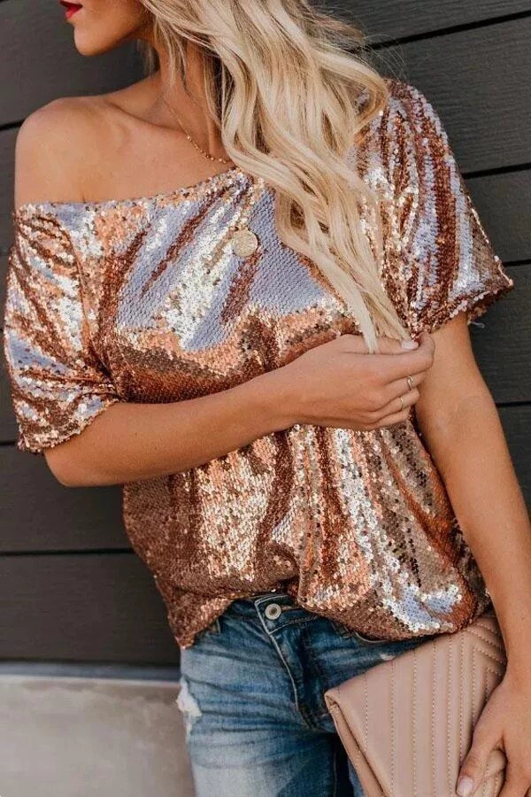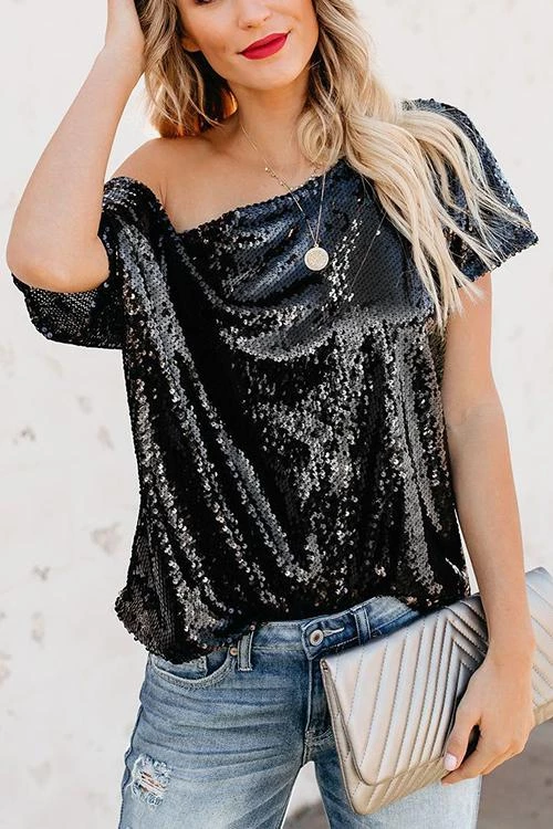 This blouse will have you ready to dance all night! It’s so shiny and shimmery! The one shoulder neckline is super feminine and flirty as well! You are going to love styling with this beauty this holiday season! This blouse features a dew shoulder neckline with short sleeve and a full sequin detailing.Â