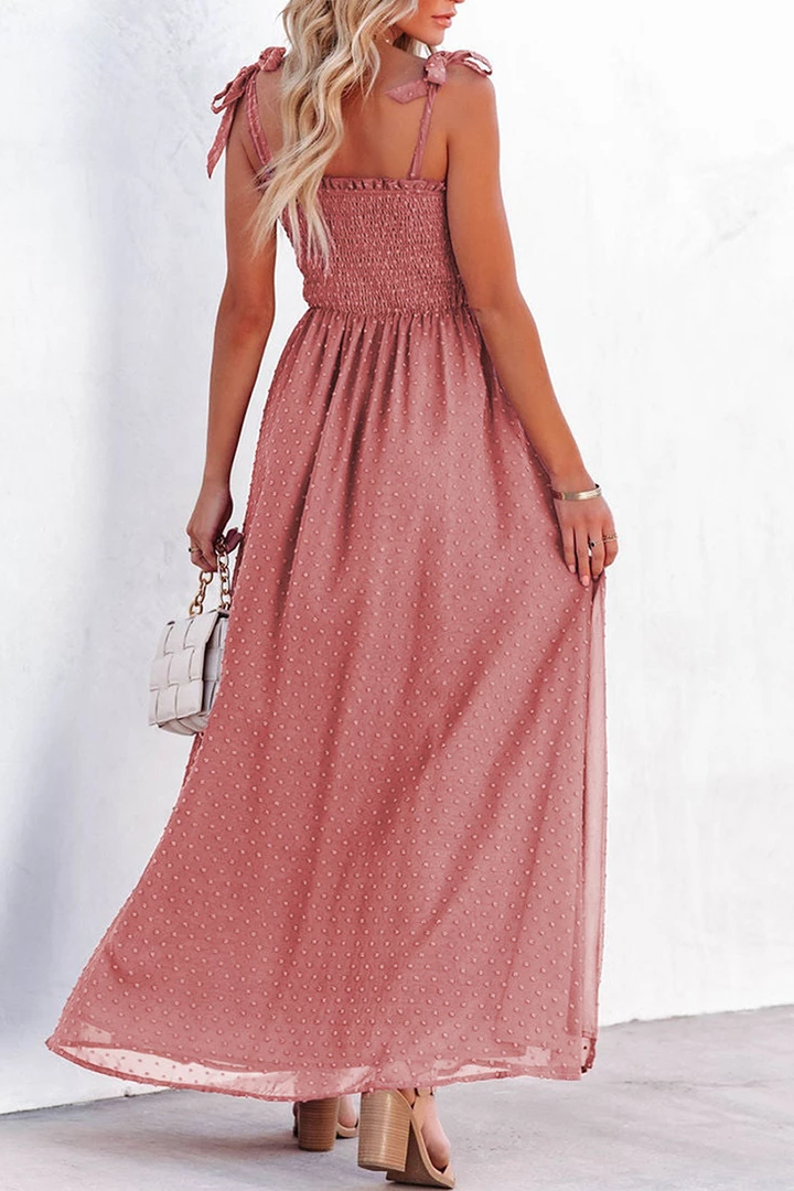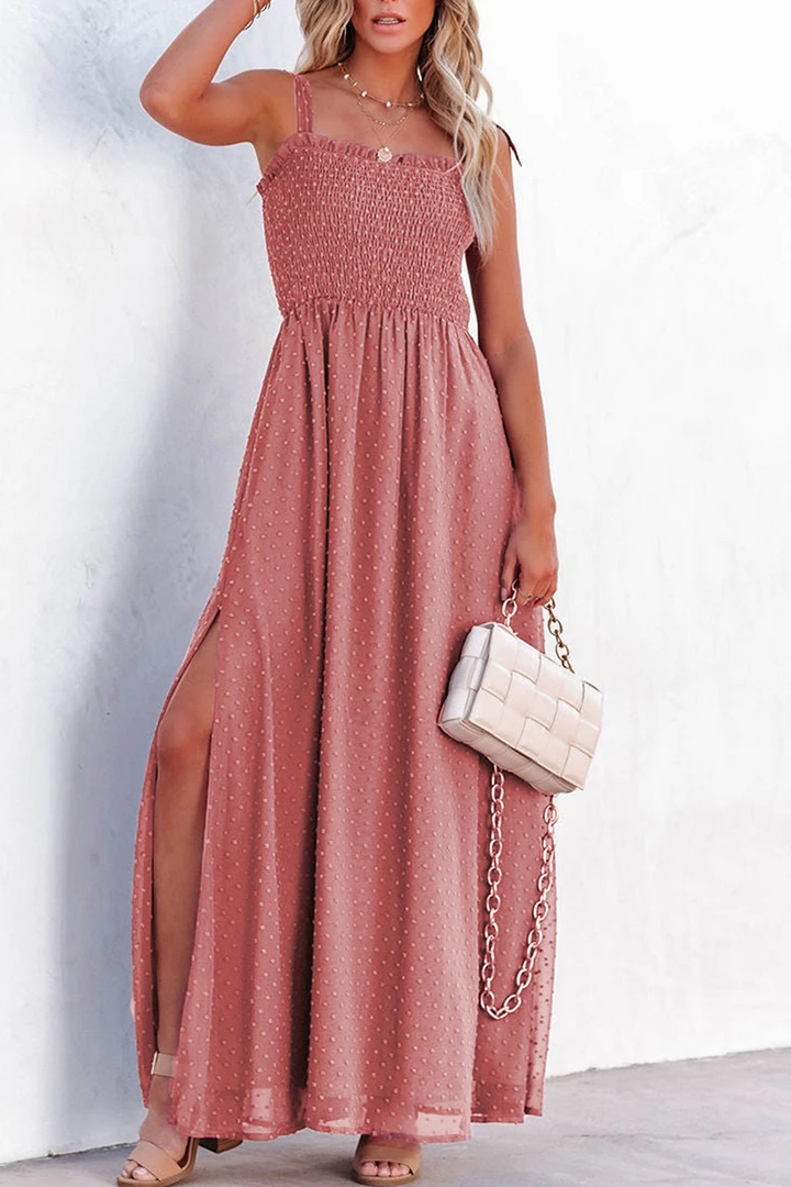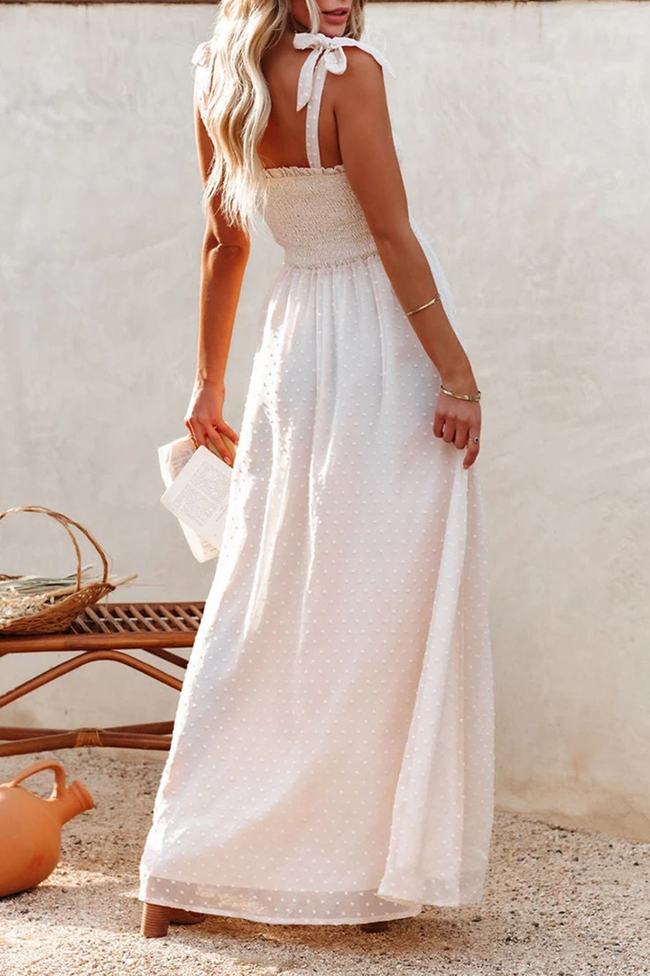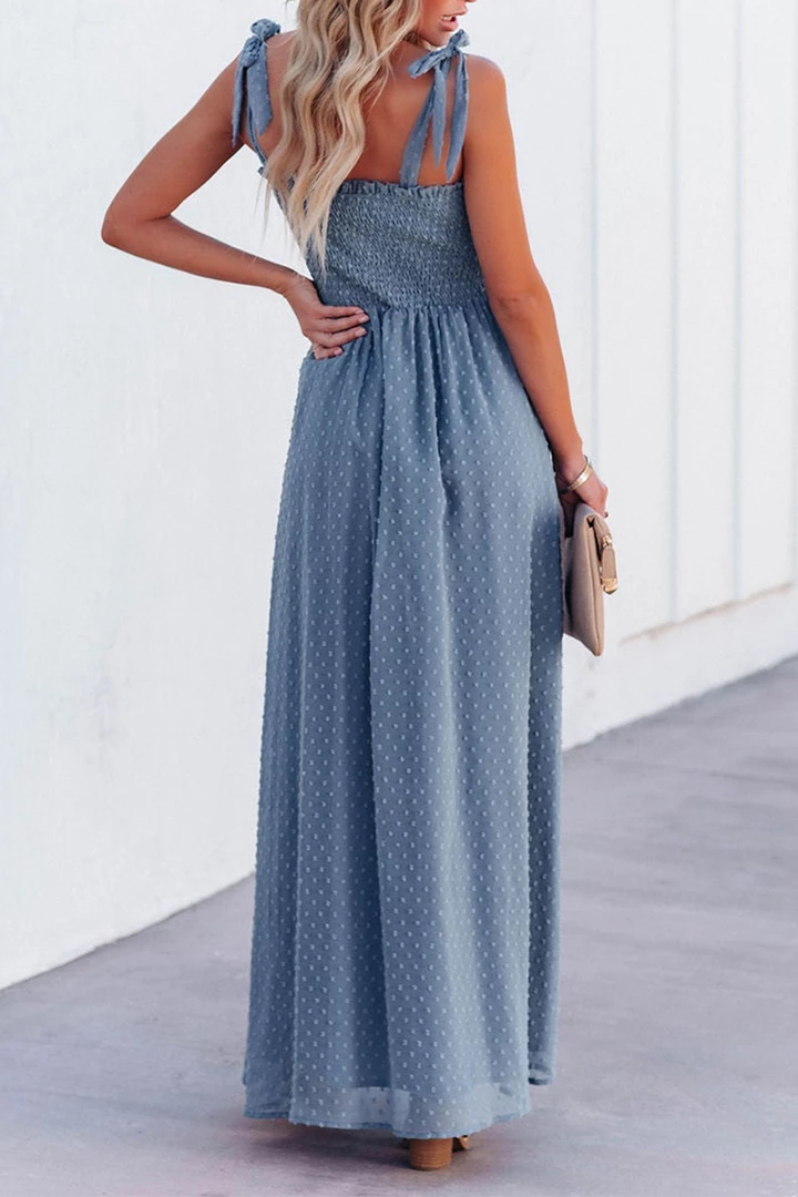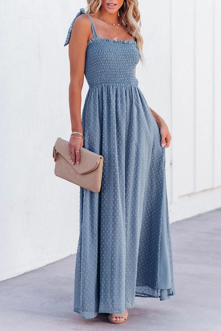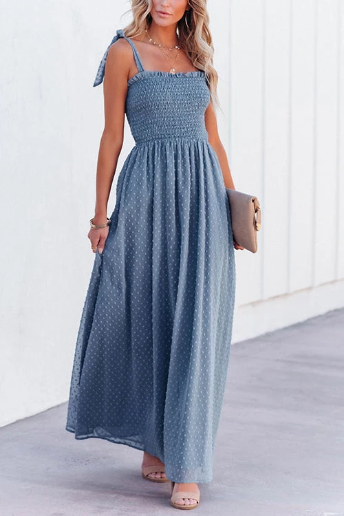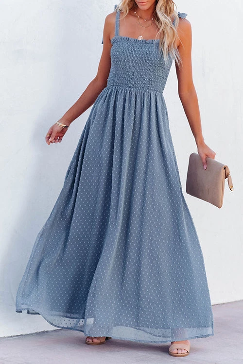 Spring is on the horizon and our Hazelle Smocked Swiss Dot Maxi Dress is ready! This french blue colored maxi features a square neckline. Designed with a smocked bust and adjustable shoulder straps.Â