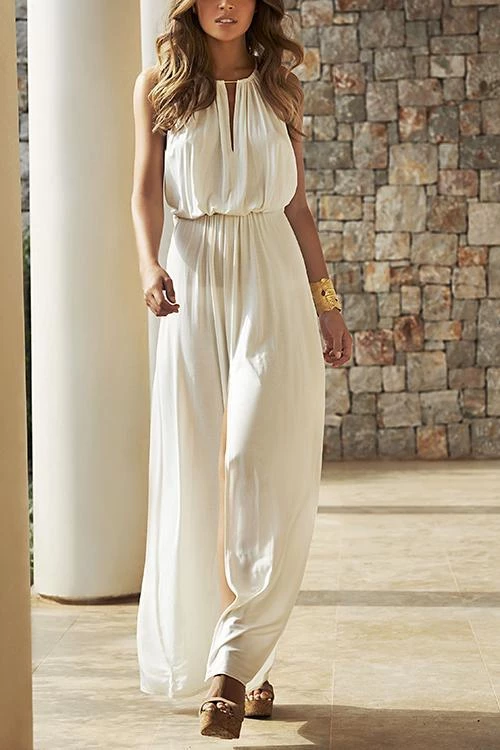 We wanna know just how you’re going to style this gorgeous jumpsuit! This versatile piece is easy to dress up or down, paired with delicate gold jewelry or bold statement pieces. This one piece style can easily be packed for your next beach vacation, or dressed up for a night out with friends. This sleeveless jumpsuit features a breathable fabric, a halter neckline and wide length hem.