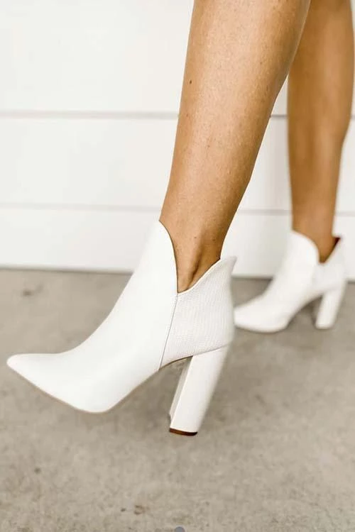 The Signal White Booties feature white faux-leather, cutouts on each side, pointed toes, and 4″ heels with a black sole.