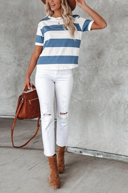 This Coastal Stripe Short Sleeve Blue Tee is a fun add to any below the knee skirt. This is a great addition to modest outfits for all women! We love the playful stripes and how they are oversized on this top. An easy to wear tee for summer.