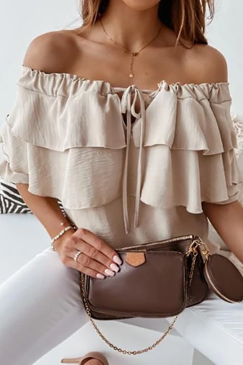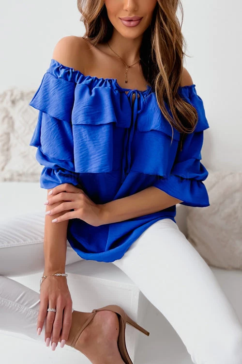 Long oversize off the shoulder tunic with double frill neckline that ties at the front. Long sleeves with elastic band. Style it with leggings and skinny jeans.Â