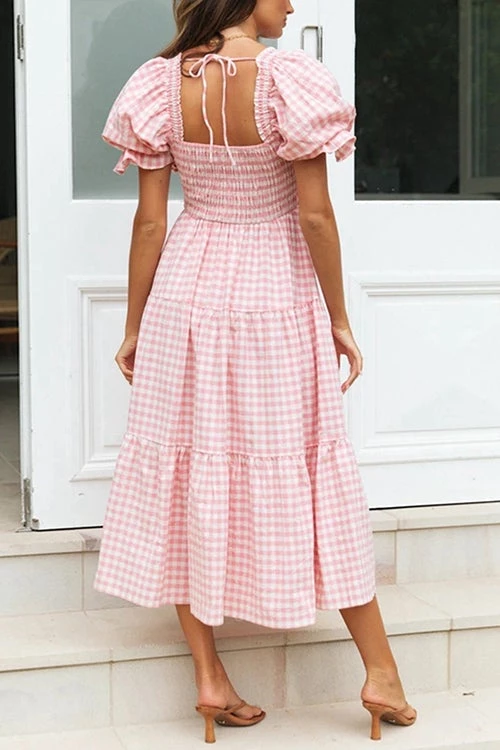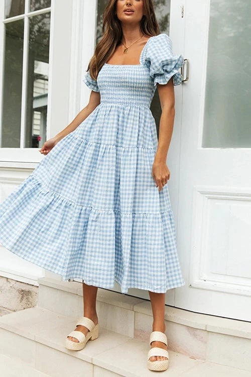 This Dress is an effortlessly cool and thoughtfully designed piece from our Own Kind exclusive range. A fun and feminine piece, ideal for every occasion. Ruched Elasticised Bust. Sleeves can be worn up or down. Frill hem. Â This statement dress comes in a stunning blue and white gingham and features puff sleeves with a square neckline and a tie closure at the back. It has a full shirred panel around the bust and waist and falls into a tiered maxi skirt. Â