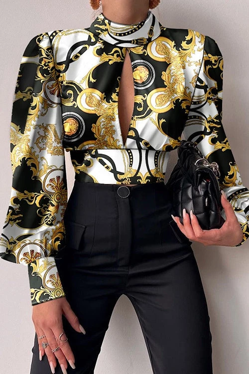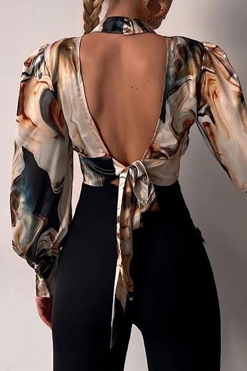 RUCHED, HAND TACKED BLOUSE AT COLLAR AND WAIST. OPEN BACK WITH ADJUSTABLE TIE. ADJUSTABLE SNAPS AT BACK COLLAR. INVISIBLE ZIPPERS AT THE CUFFS FOR EITHER A BILLOWED SLEEVE OR AN OPEN ELONGATED SLEEVE.