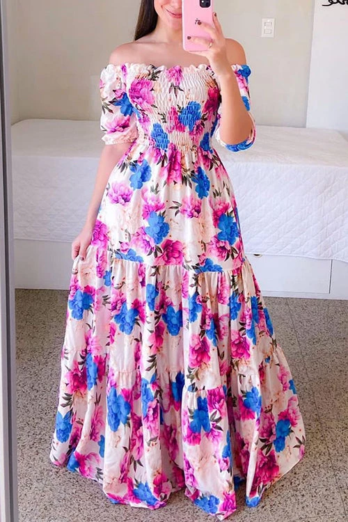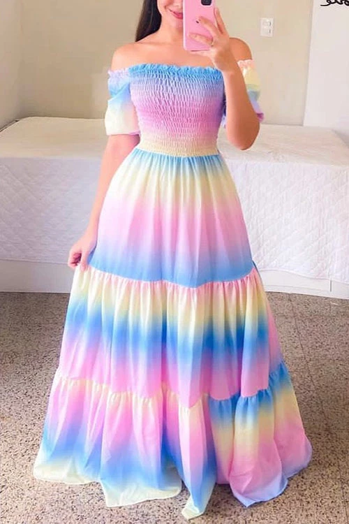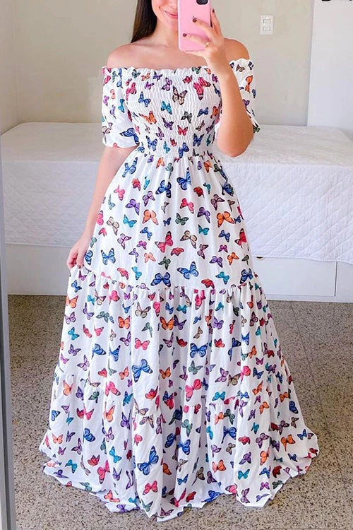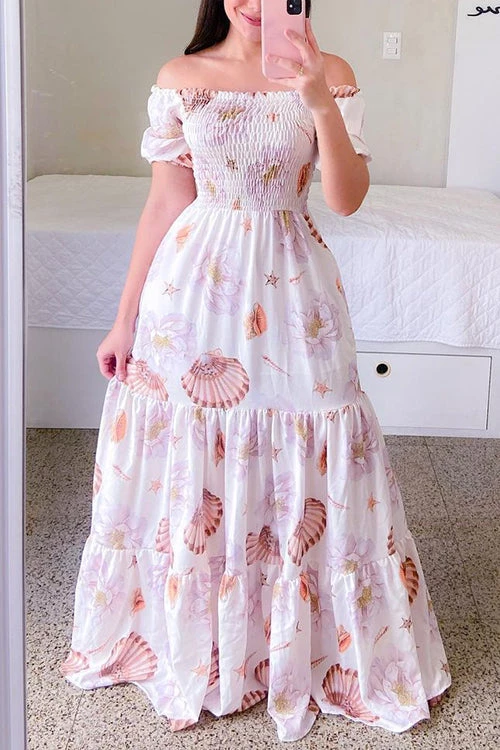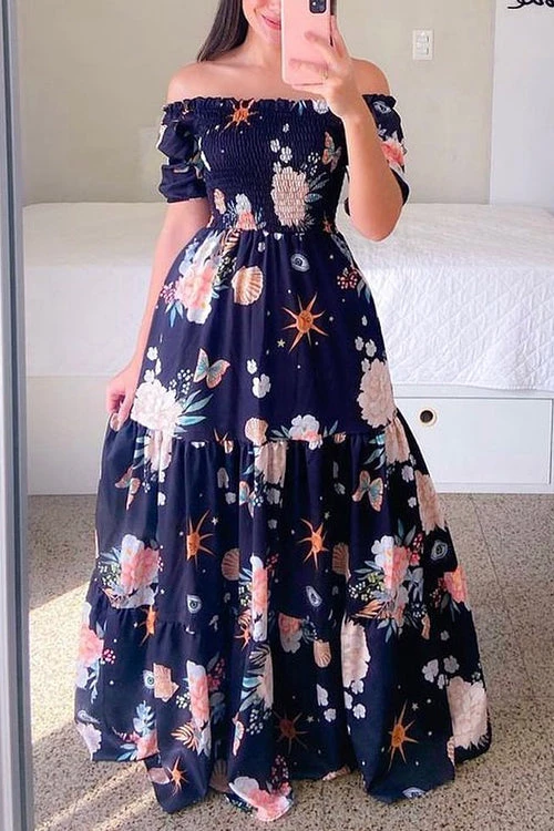 Our new Dress features long swishy skirt, off shoulder, shirred bust and an overall relaxed fit. We love this stunner paired with minimal gold jewels for an elegant touch.