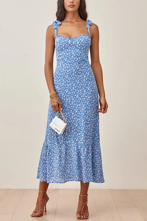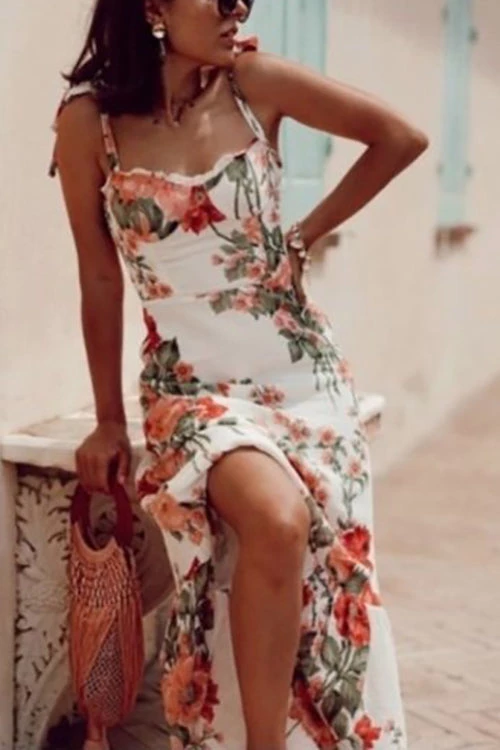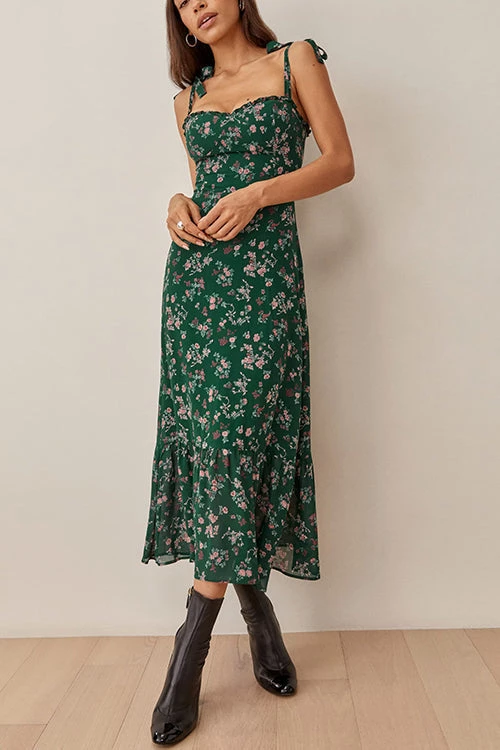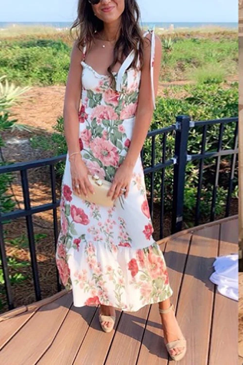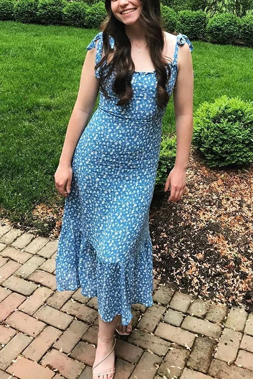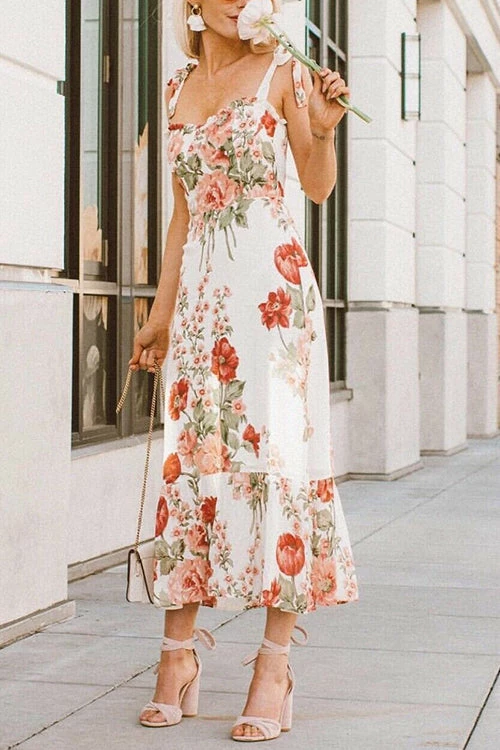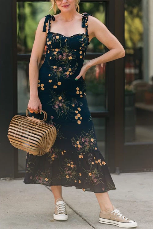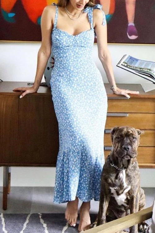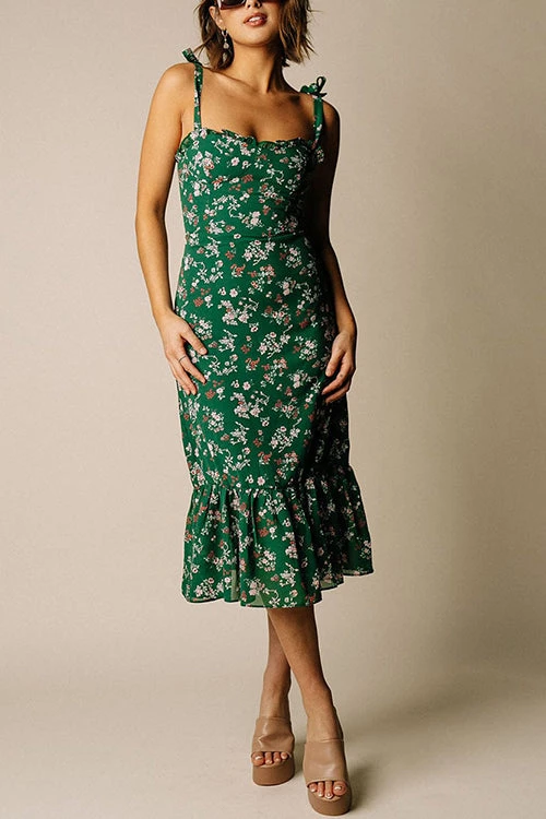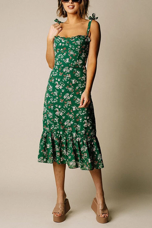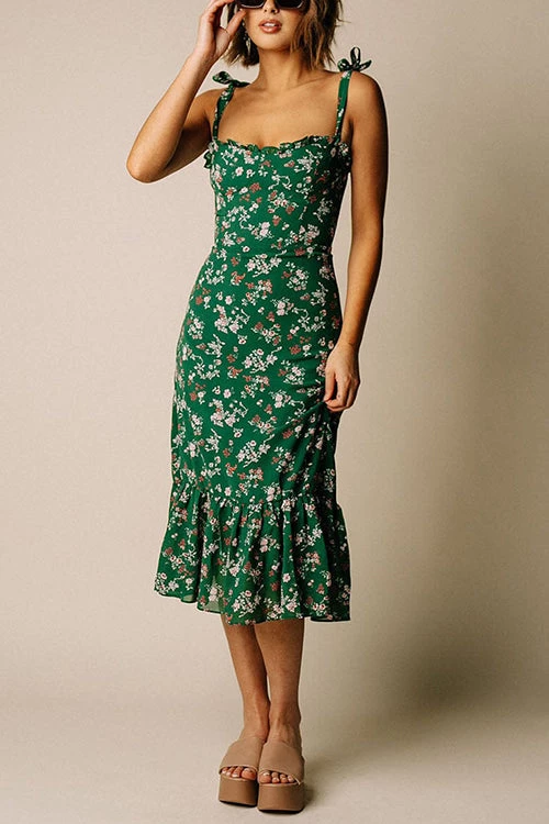 Ankle alert. The dress is fitted in the bodice and waist with a relaxed fitting skirt. This midi length dress has a ruffle edged neckline, adjustable strap ties, and a trumpet skirt. It gives you a pretty good balance of comfort and shape. The Dress pairs well with Strappy Mid Heel Sandal.