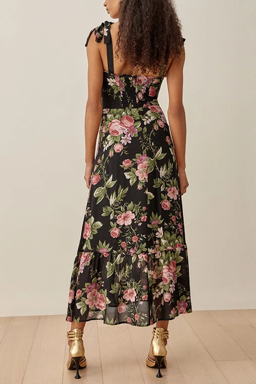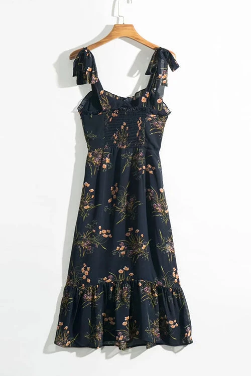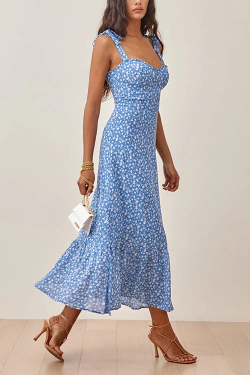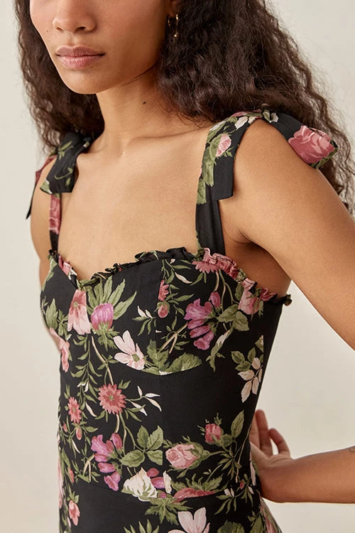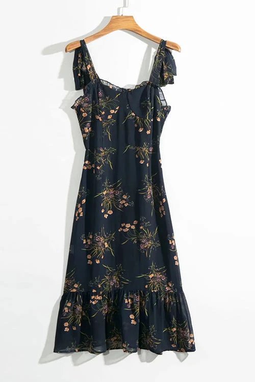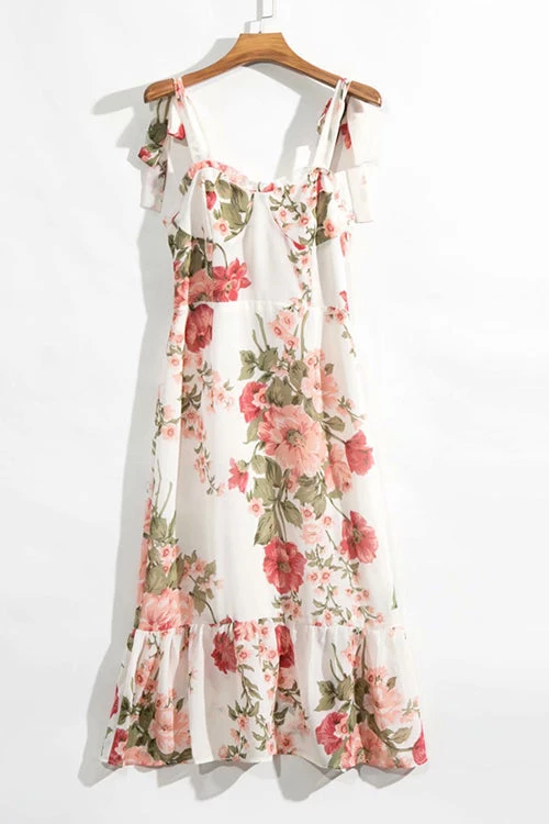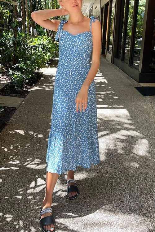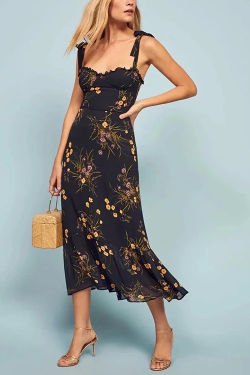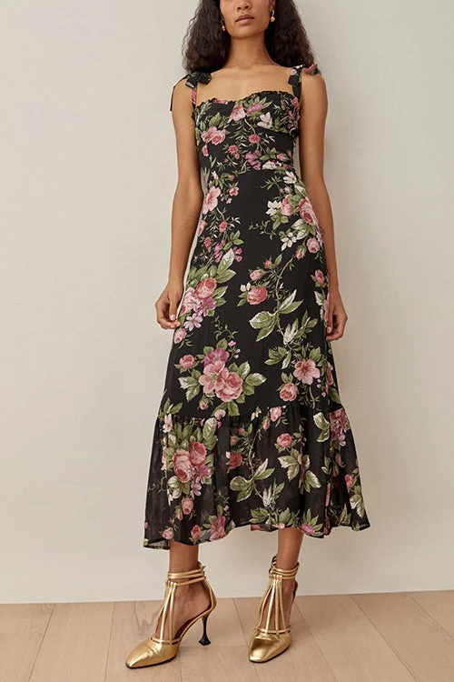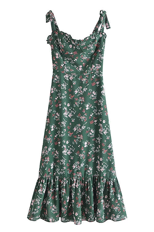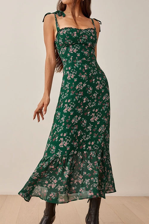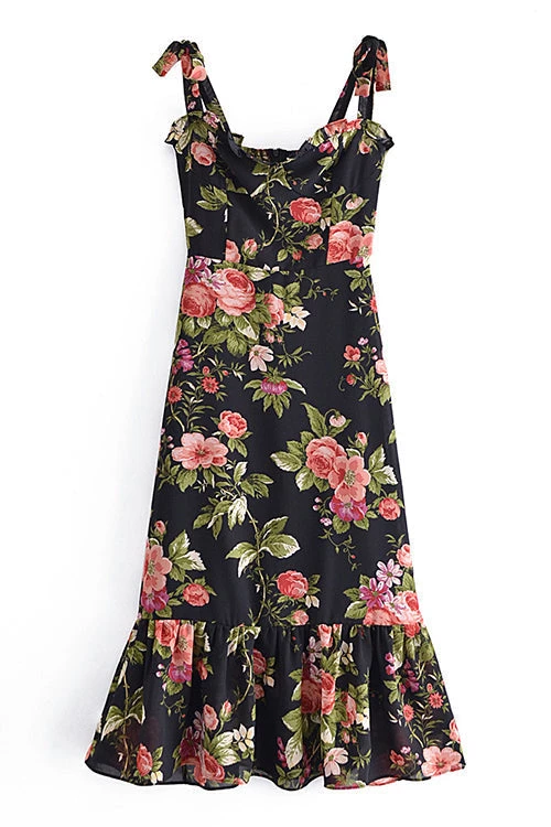 Ankle alert. The dress is fitted in the bodice and waist with a relaxed fitting skirt. This midi length dress has a ruffle edged neckline, adjustable strap ties, and a trumpet skirt. It gives you a pretty good balance of comfort and shape. The Dress pairs well with Strappy Mid Heel Sandal.