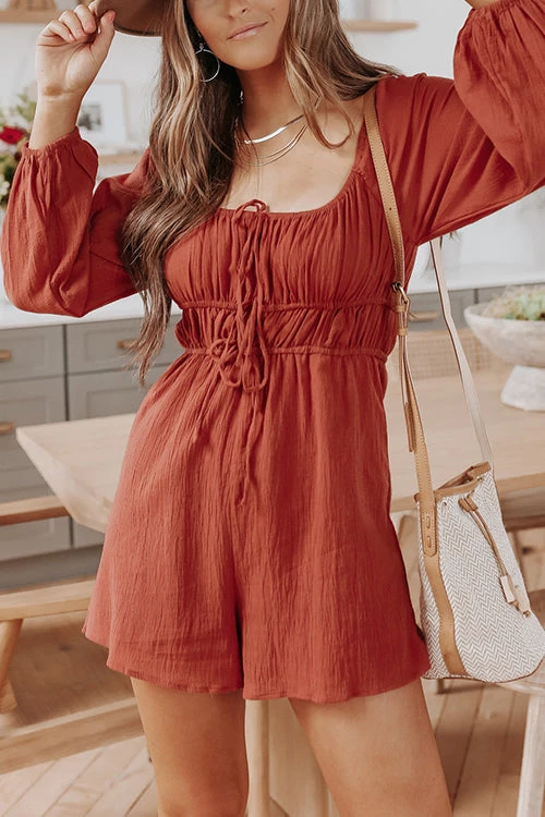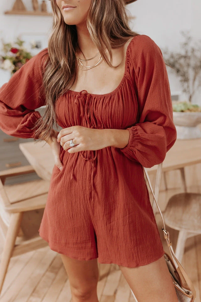 Effortlessly essential, this beautiful romper deserves to be shown off. Featuring double side ties with an elastic waist, front button closure, and exaggerated short sleeves for extra shape. Pair with wrap sandals and a straw bucket hat for an effortlessly fun and flirty look!