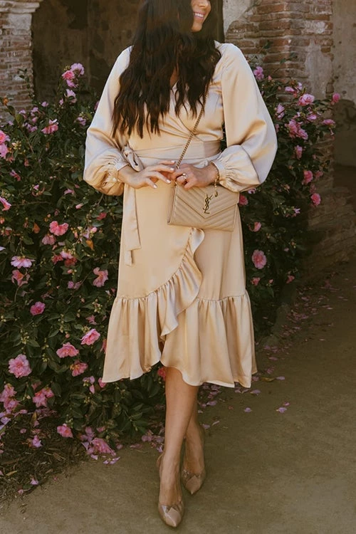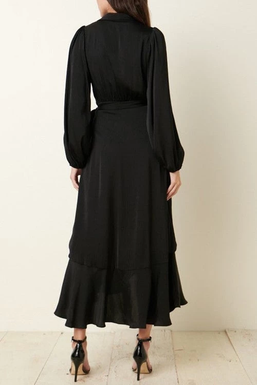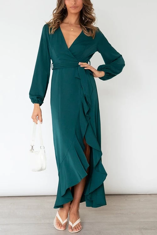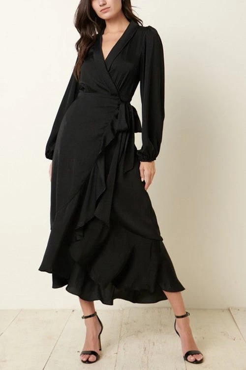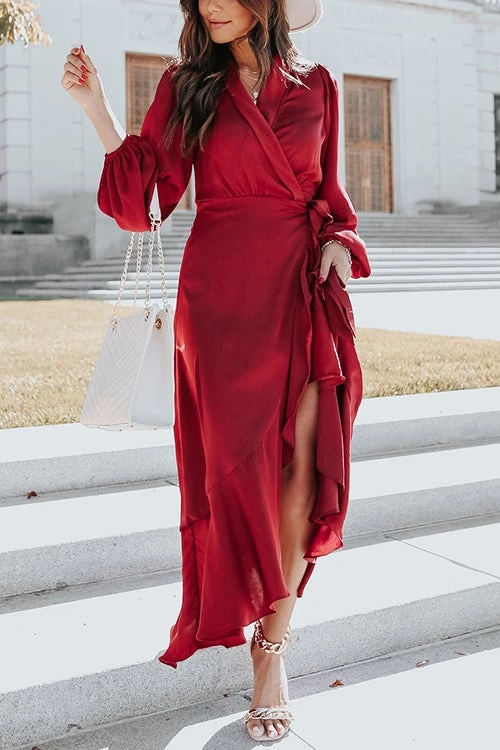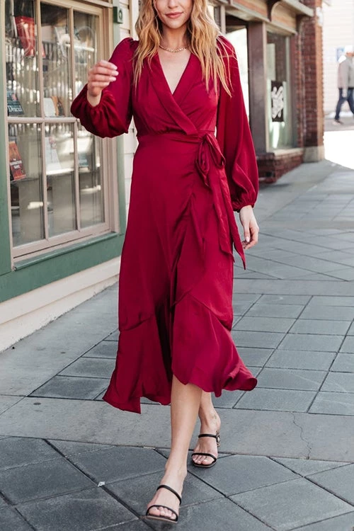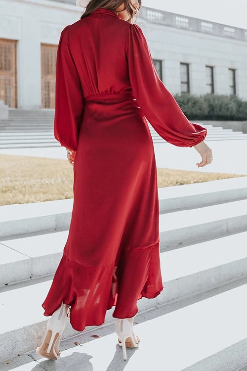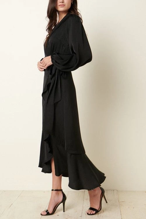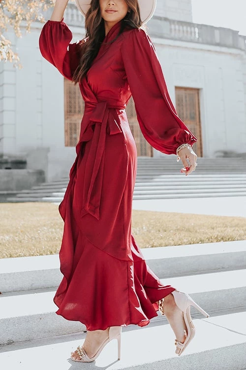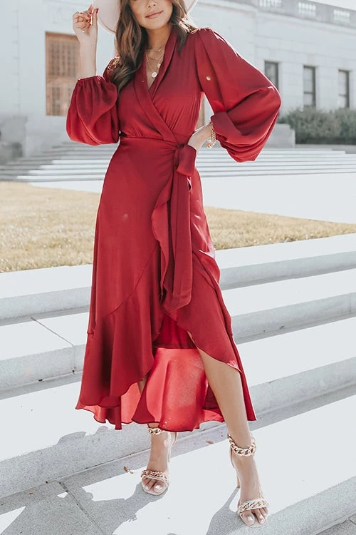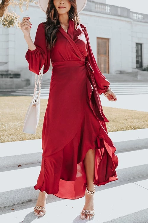 Make a statement at your next event this fall wearing our High Low Wine Wrap Maxi Dress. Create the perfect look for your next wedding! Such a stunning piece that will be perfect for the Holiday Season. This dress is featured in a tie waist closure, hi low hemline, balloon sleeve, surplice front, and ruffle skirt detail. Such a standout dress doesn’t require much to dress up, just a simple heel and jewelry.Â