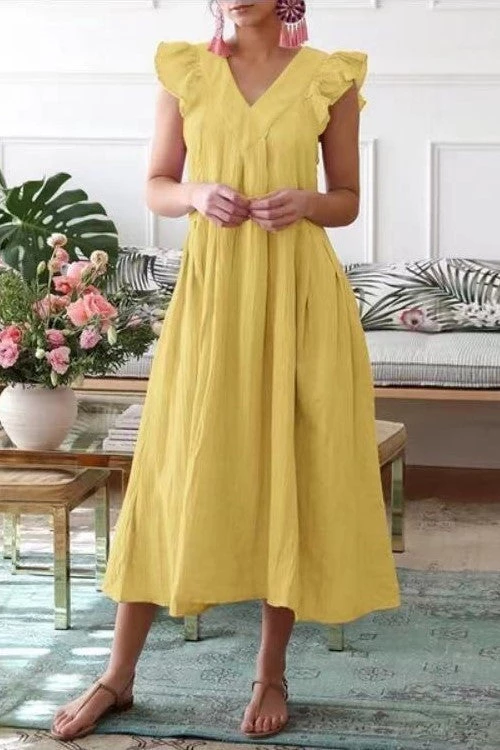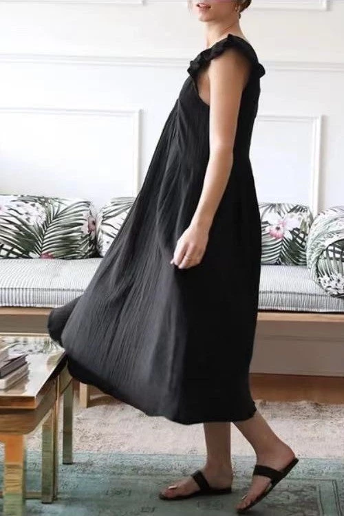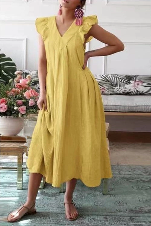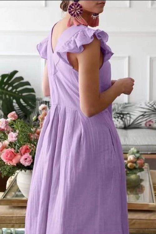 He shows you his love in Meaningful Ways, like bringing you flowers and coffee to work, and helping with all the things around the house. That’s as it should be. But, I’m the charming midi dress that shows how fabulous you are every time you wear me. Uh-huh. So. Who loves you more? Me. Duh. This dress features a breezy drop-waist fit, ruffled shoulders, and an elegant V-neck.