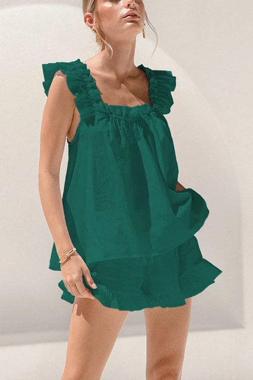 Wake up on the right side of the bed every morning in this white pj set. Elastic waist makes this set comfy, while adorable ruffles on the shorts hem and tank top straps keep it chic.