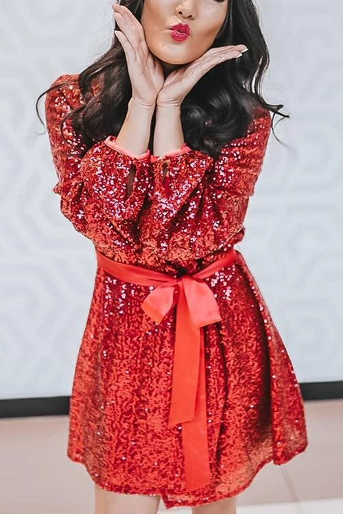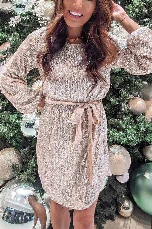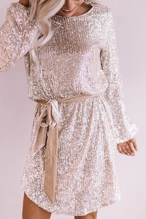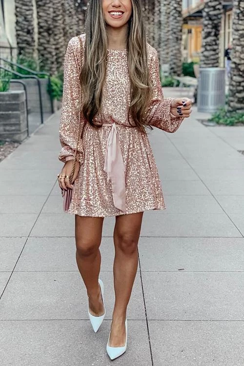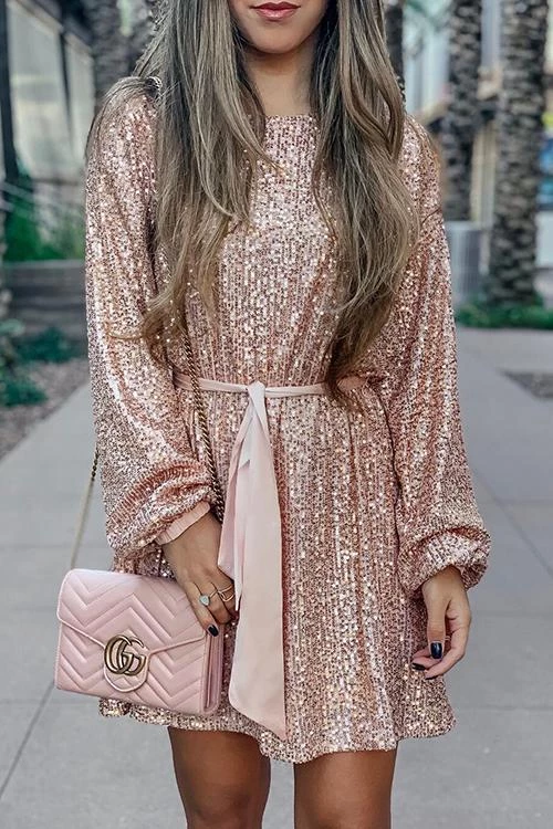 Add a little “ritz and glitz” to your wardrobe with this stunning neutral hued dress featuring lightweight material patterned with shimmering sequin stripes, a high rounded neckline, long loose bishop sleeves with fitted elastic banded cuffs, a satin tie belt, and a relaxed silhouette that falls into a rounded mid-thigh length hemline! This party piece styles perfectly with a matching glitzy wrap up heel and clutch, or you can add a pop of color when you wear it with “The Brinkley Heel” and our “Tassel Talk Earrings in Wine!”